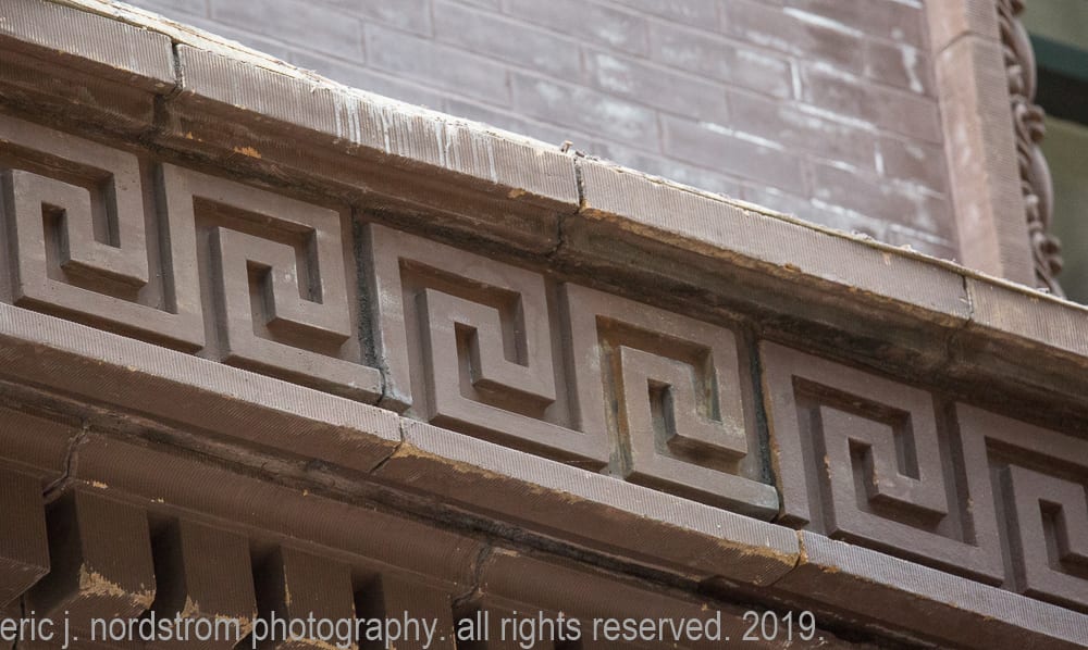 june 10th, 2019: terra cotta restoration work being done on holabird and roche’s 16-story marquette building. the reddish-brown terra cotta frieze panels with alternating pattern of interlocking anthemions, flowers and scrollwork are located above the large storefront windows. the panels along the east facade have been removed for repair or replacement.