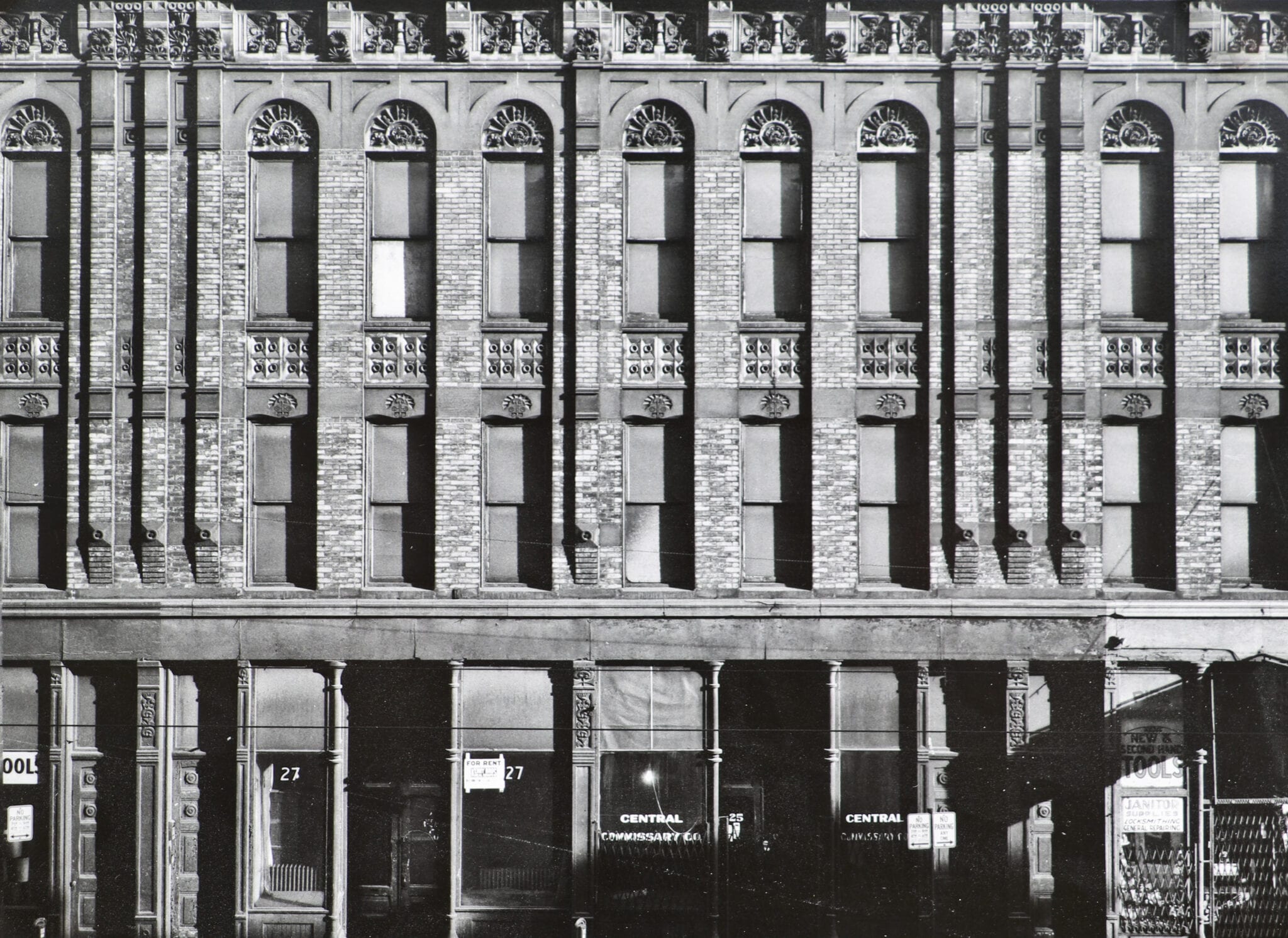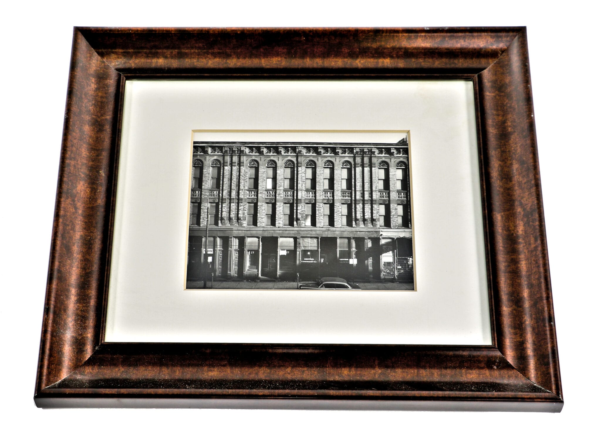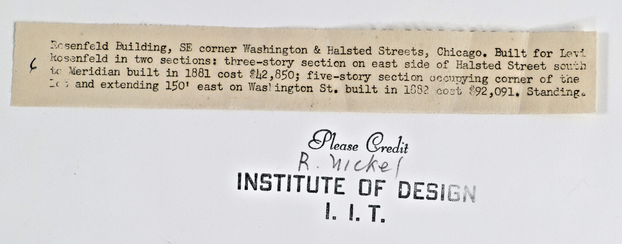 the framed silver gelatin print (courtesy of the bldg. 51 museum collection) above, was taken by richard nickel, then a student at the illinois institute of technology, with his stamp and signature on verso. the photographic print features the east facade of the rosenfeld building, which by that time was largely vacated. it was demolished in 1958.