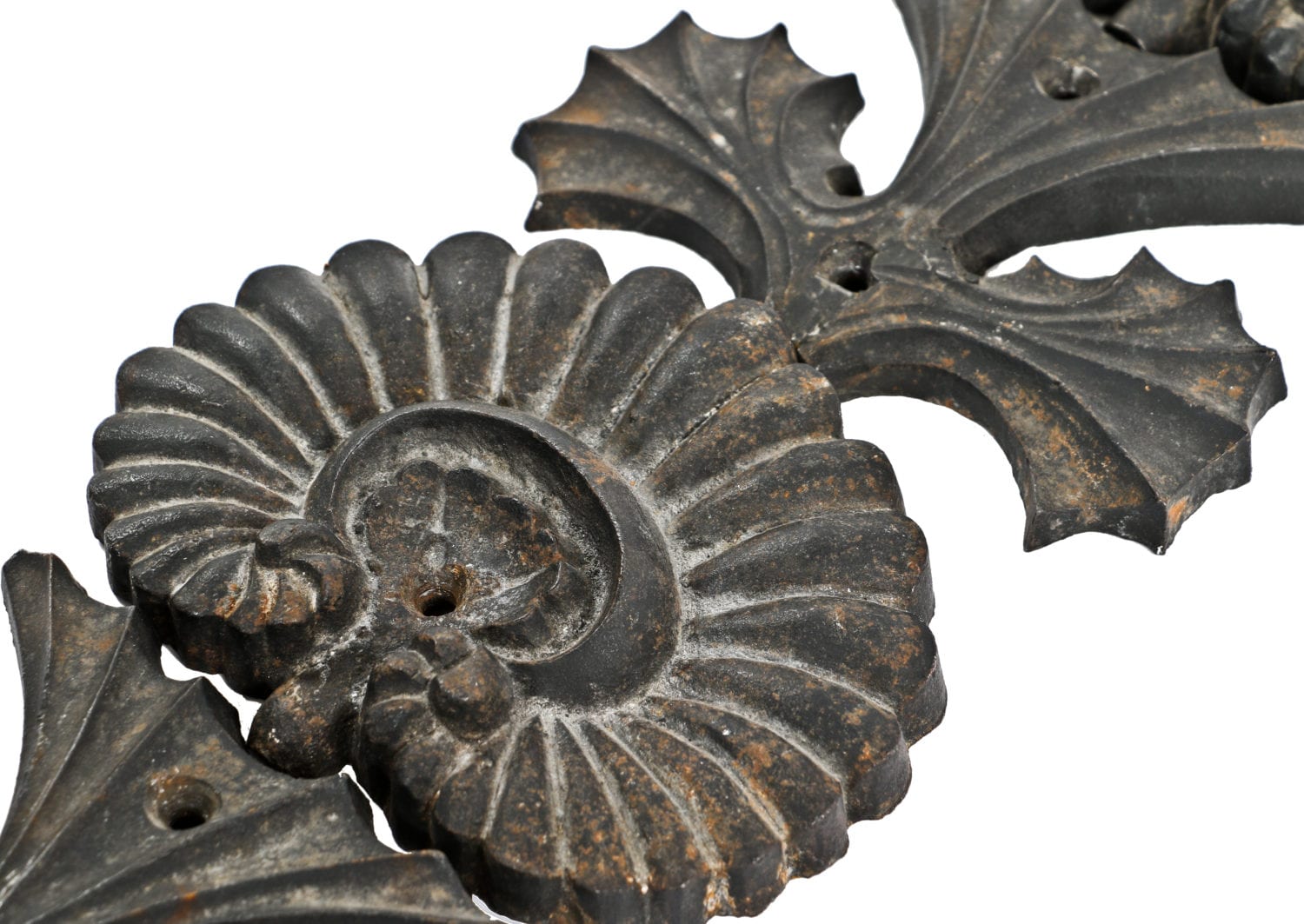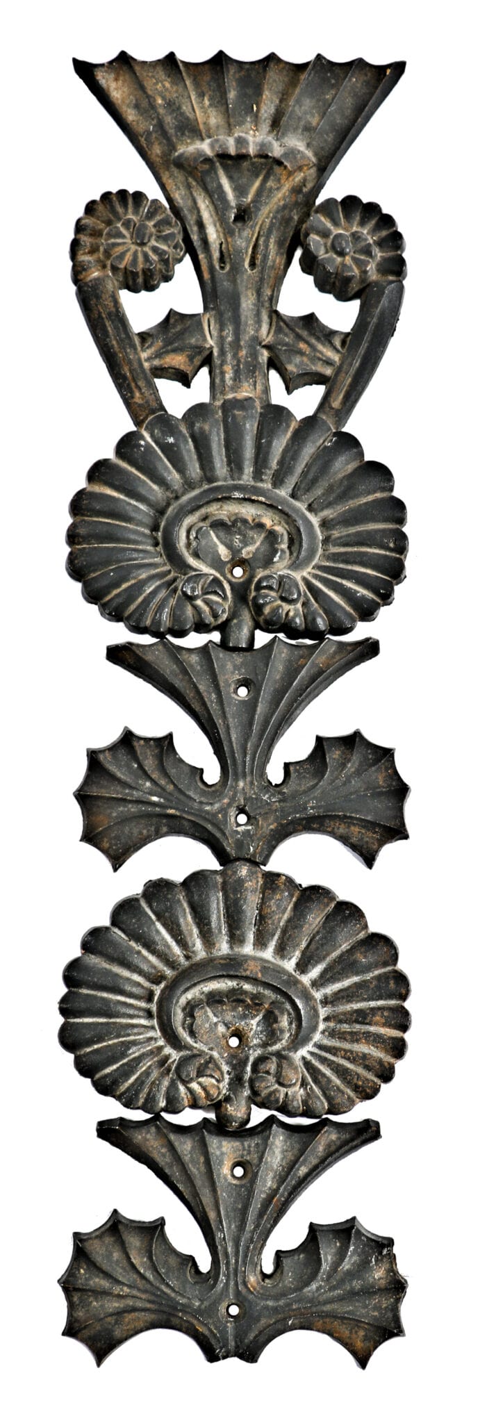 the black enameled cast iron ornament (courtesy of the bldg. 51 museum collection) above, is comprised of four distinct sections containing screw holes for anchoring the flush mount plates against the pilasters. the iron and terra cotta ornament was salvaged  – in 1958 – by richard nickel and other institute of design students.