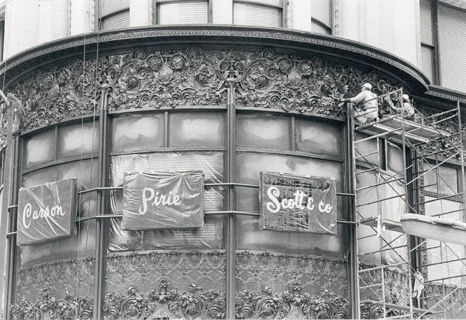 another chapter in the building’s history began in 1946, as the store discovered that the cornice’s iron anchors were failing, and opted to remove them. it remains a mystery where the removed material was dumped, as no remnants have been found. in the late 1990’s restoration architects led by gunny harboe took on the daunting project of replacing these missing pieces. using what scarce documentation was available, they deduced what the cornice looked like and painstakingly reconstructed this absent element to restore the integrity of the original design.