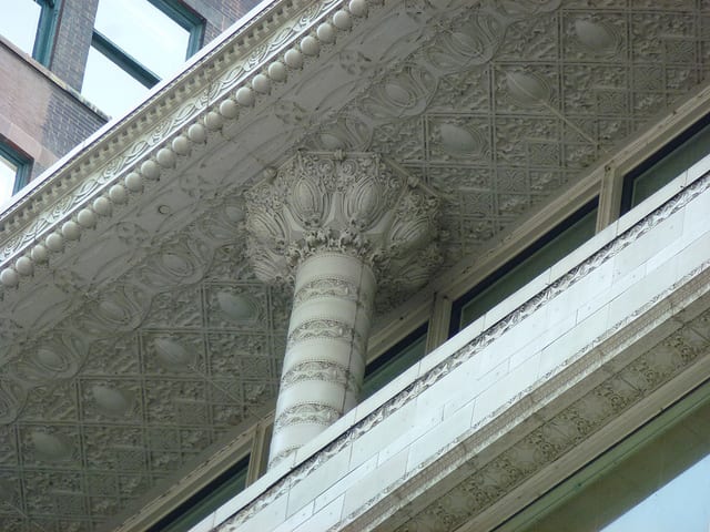 further, they help picture how the repeating ornament ties disparate materials together, pushing the limits of stone and metalwork simultaneously. sullivan intended the high relief storefront to complement the terra cotta cornice on the top floor, and supervised the craftsmen meticulously to that end.