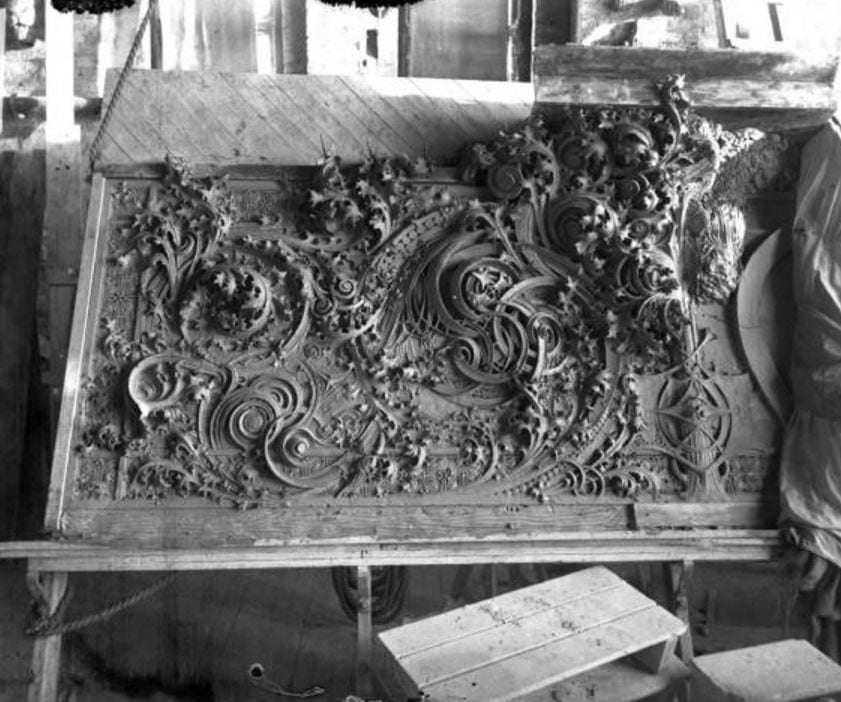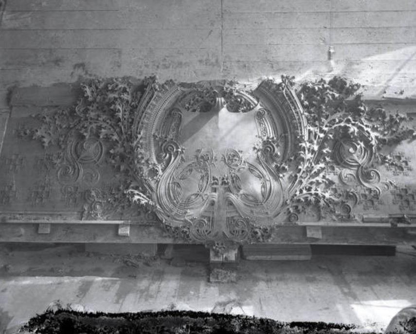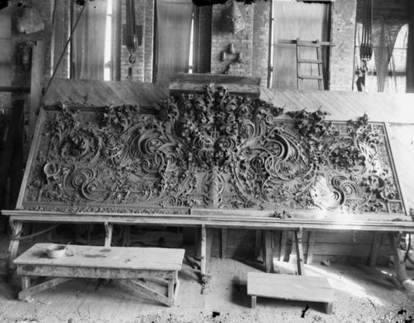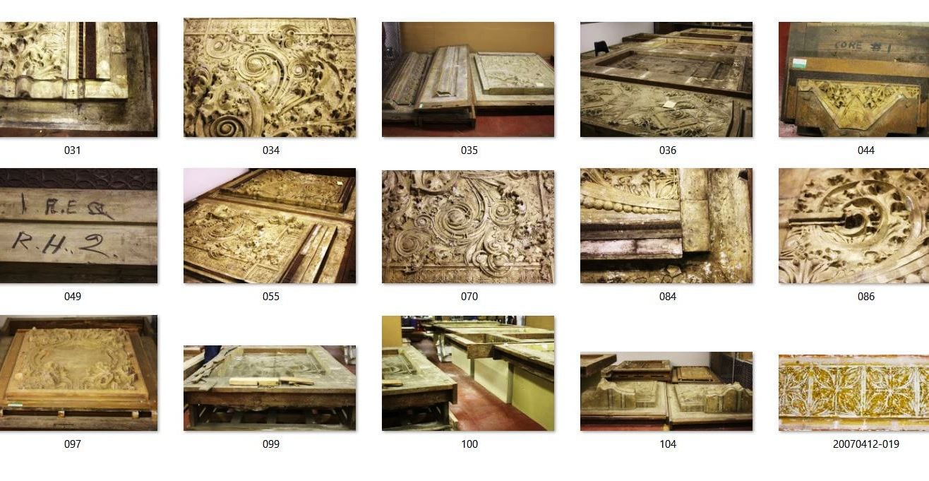 several years ago i had the privilege, alongside a fellow chicago architectural business owner, of visiting the university of wisconsin-milwaukee’s historic preservation department, on a memorable roadtrip to examine the original molds the university had acquired. the molds had been rescued by a professor from the architecture department from being trashed by carson pirie scott & company, when it came time to clear out an old storage facility they kept in wisconsin. now tucked away in a field house, among lawnmowers, field equipment and other such mundane objects, were these oversized and incredibly detailed pattern molds (and plaster and composite ornament), in surprisingly good condition. they were badly needing a new home, and stuart and i were called up there to assist in finding the right place for this vast collection of molded plaster ornament.