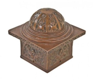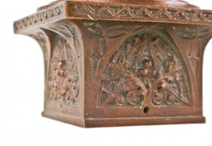 with this in mind, the molds in the university collection are notable for helping unveil a complicated construction process, unfolding over many years. on a more sentimental note, artifacts from the former schlesinger & mayer building are largely responsible for inspiring or kicking off the bldg. 51 collection back in 2006. a terra cotta stringcourse panel and a copper-plated cast iron newel post are the first two items acquired in my serious and passionate effort to gather together important pieces of chicago architecture while operating urban remains for the past 10 years. when, in 1991, a flood brought disaster to the basement levels, several dumpsters-worth of iron were slated to be tossed and an employee with a keen eye fished out these several pieces. i often joke that if i were to become destitute, the last possession i’d hold onto is the exquisite sullivan and elmslie-designed newel post cap.