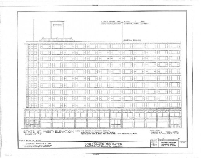 now known as the sullivan center, this structure at 1 south state street was designed by louis sullivan for the retail firm schlesinger & mayer in 1899. the trajectory of the building’s planning and construction was such that renovations or additions continued throughout the 1890’s and into the twentieth century. the building’s story stretches as far back as the great fire of 1871, when bavarian immigrants and newly displaced merchants leopold schlesinger and david mayer began a partnership. in 1881 the two men had moved their dry-goods store into the bowen building on the corner of state and madison. ten years later (1891), they hired adler and sullivan to prepare bold plans for the removal of the bowen building’s attic story and the addition of two stories across the bowen building, as well as adding the adjacent four-story structure to the south. in 1898 schlesinger and mayer decided to remove the original building located on state and madison and replace it with an entirely new building designed by sullivan. he subsequently created a nine and twelve-story proposal, and though they eventually started with a nine-story portion of the building on madison street, schlesinger and mayer came back several years later wanting a twenty story building. they eventually settled for twelve stories, barring a previously added portion of the structure which did not structurally support more floors (and which was left as is). though the building was originally planned to be marble, a stonecutters strike in 1898 forced builders to switch to terra cotta (ultimately, a more lightweight and inexpensive material).
