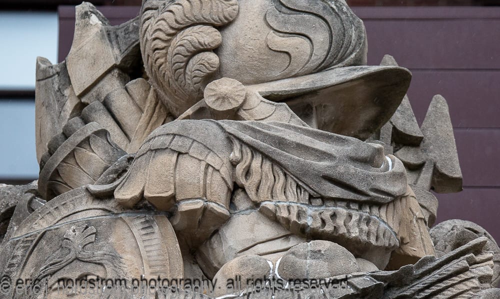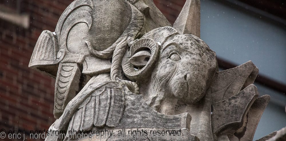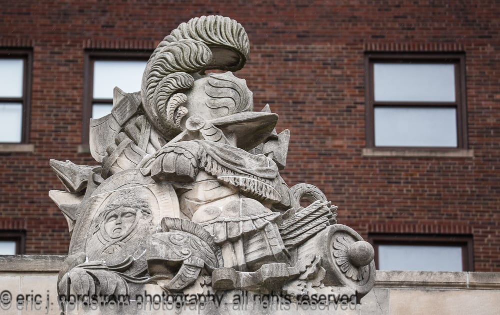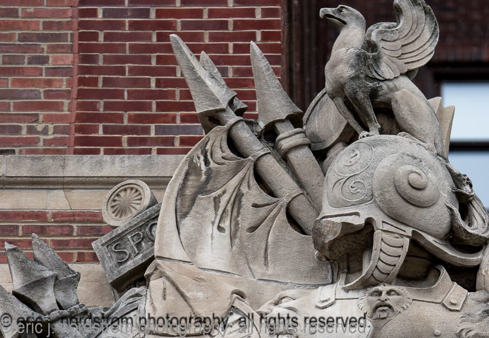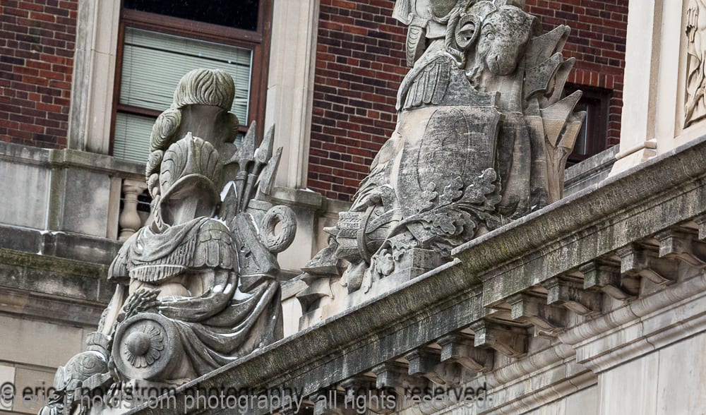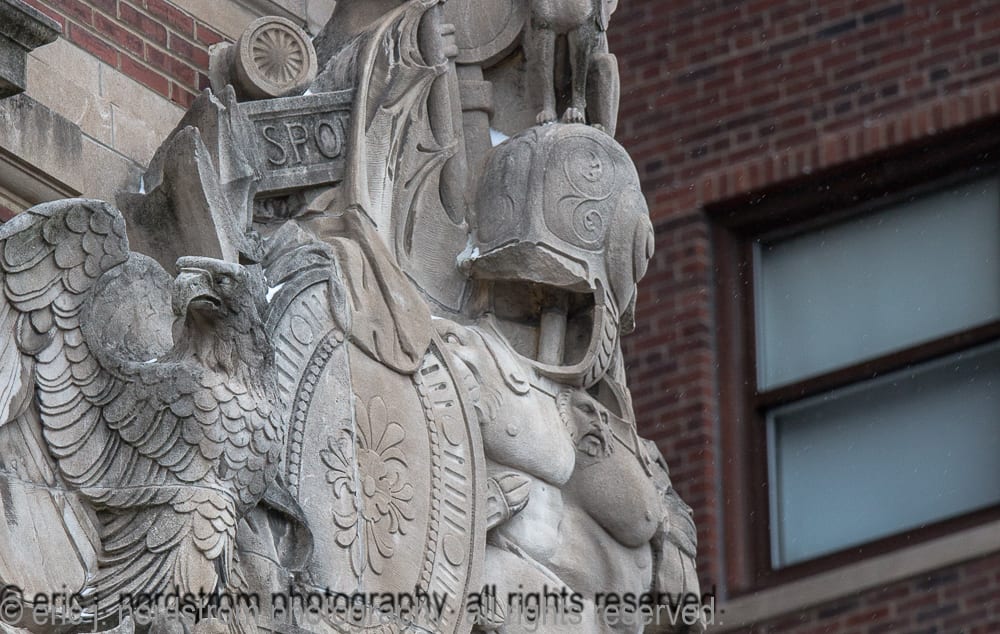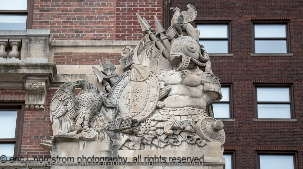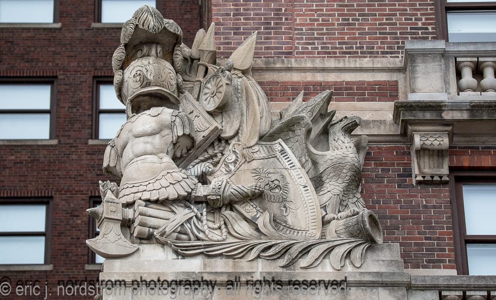 the following images highlight an in-depth photographic survey of the massive exterior carved bedford limestone sculptures adorning the facade of hoabird and roche’s stevens hotel (1927). the exterior limestone was executed by the indiana limestone company, bedford, ind.