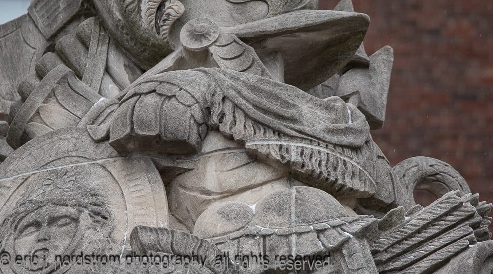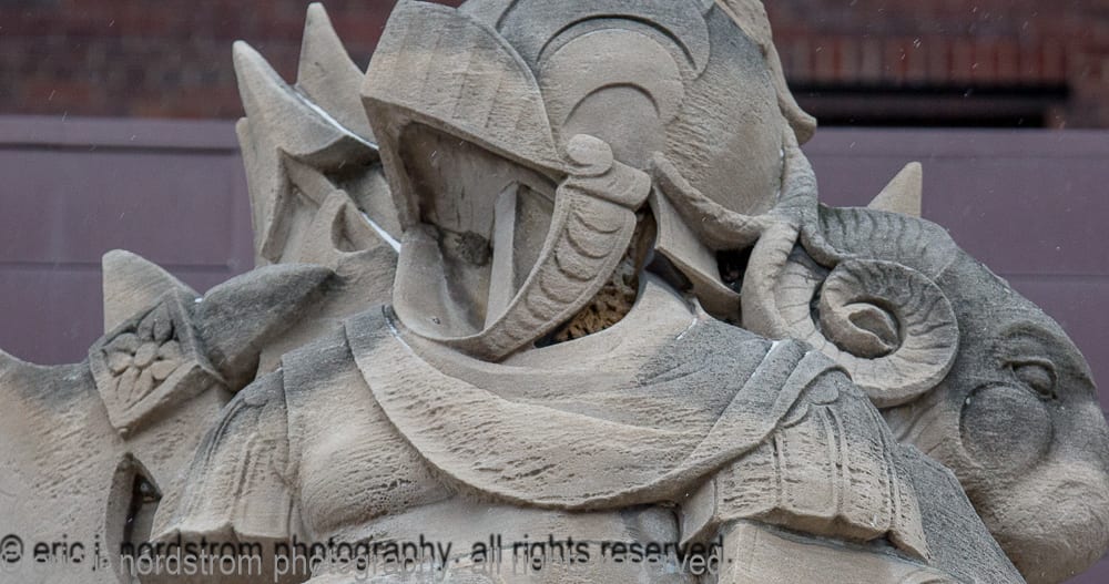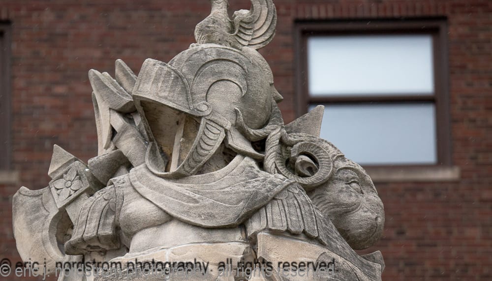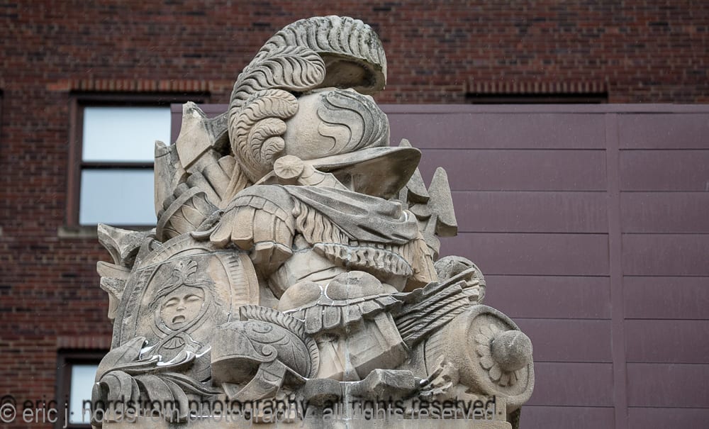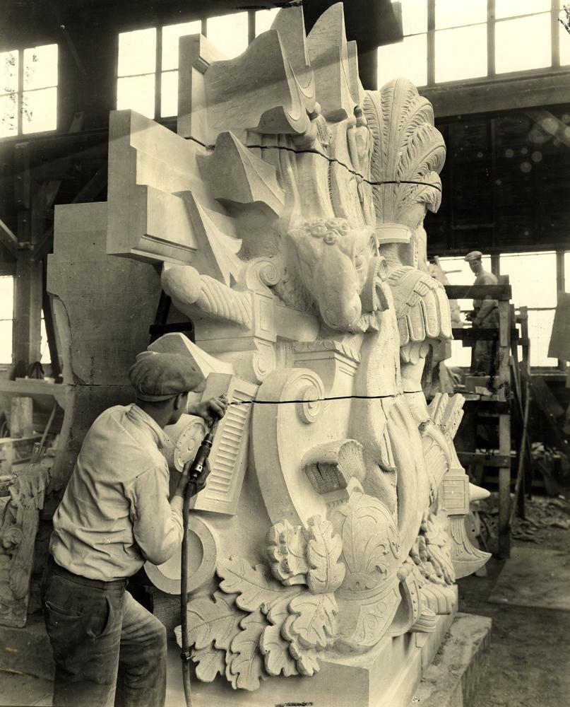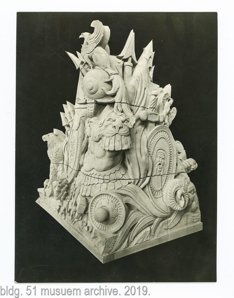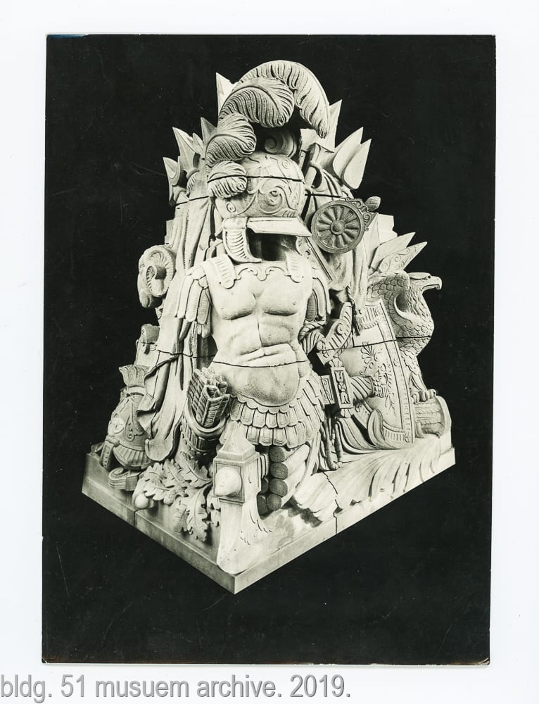 note: the period images above, were acquired by the bldg. 51 musuem archive. the 8 x 10 silver gelatin prints were made for the indiana limestone company after the stone monuments or sculptures were completed in their shop. it’s interesting to see them in an isolated setting (e.g., before they transported to chicago and installed in the stevens) with controlled lighting used to capture any and all detail shortly after being sculpted and cleaned.