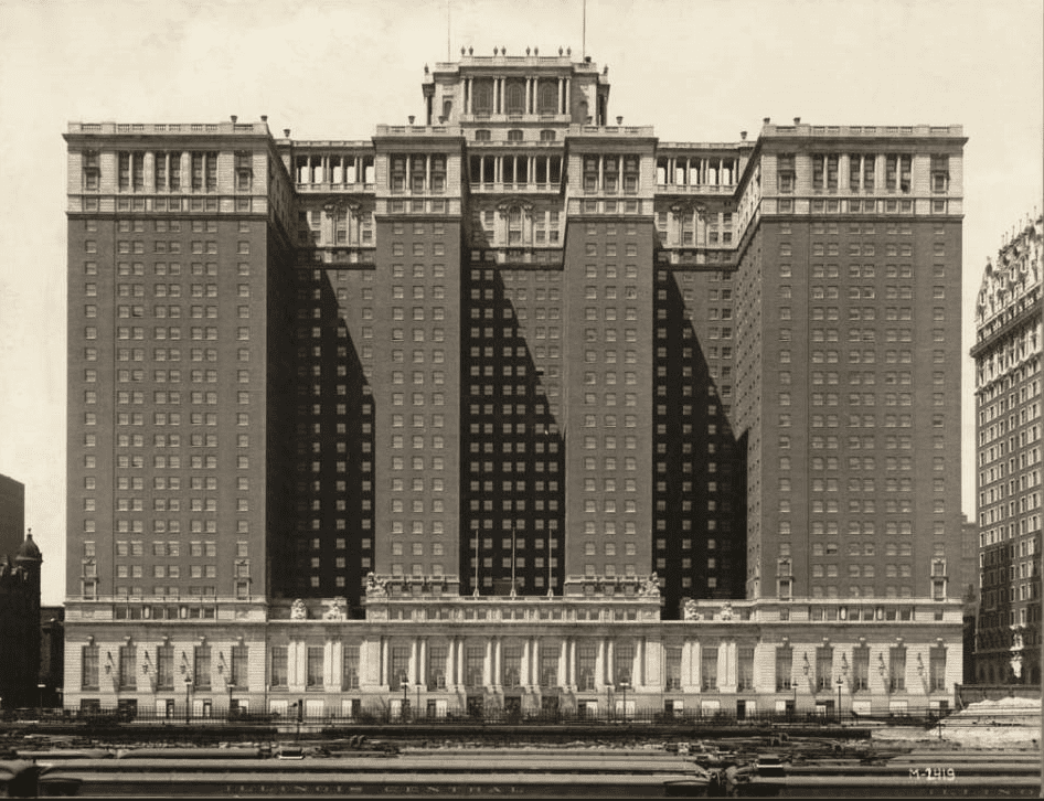 the beaux-arts hotel was developed by james w. stevens, his son ernest, and their family who ran the illinois life insurance company and owned the hotel la salle, also designed by Holabird and roche. the stevens featured 3,000 guest rooms, cost approximately $30 million to construct, and boasted of a virtual “city within a city.” the stevens housed its own bowling alley, barber shop, rooftop miniature golf course (the “high-ho club”), movie theater, ice cream shop, and drug store.