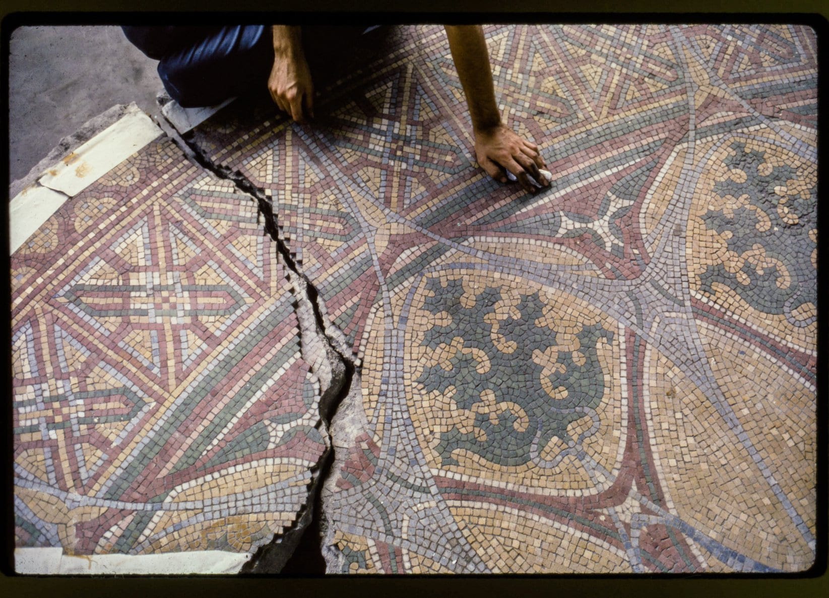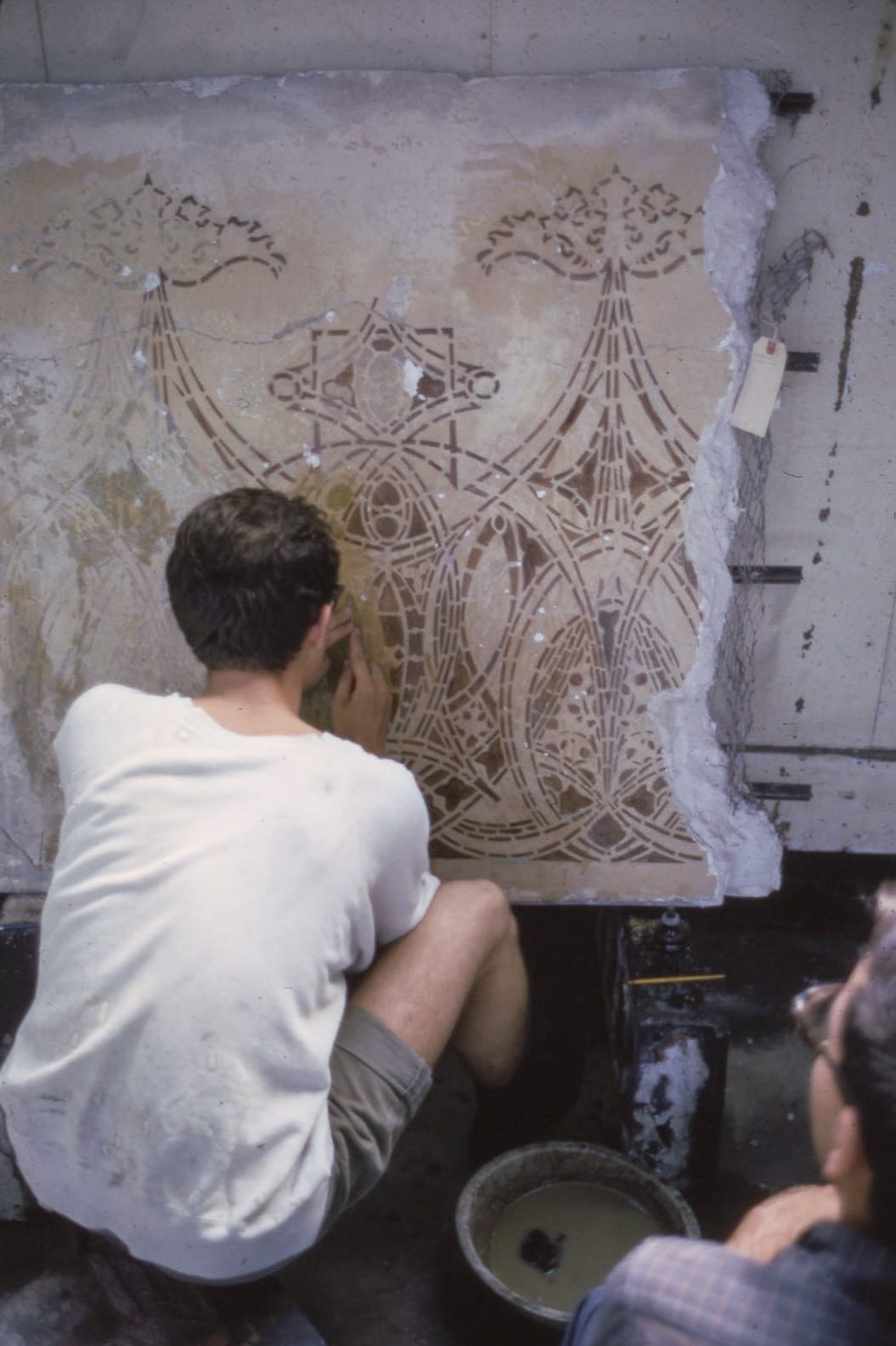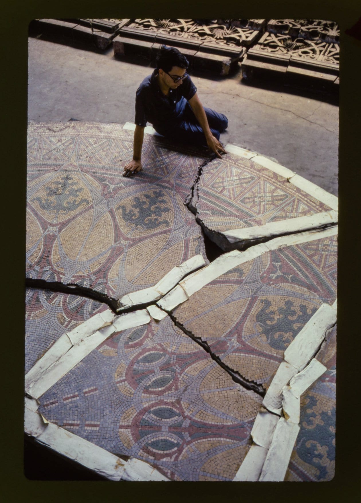 richard nickel kodachromes taken at navy pier between 1961-63. three images show john vinci examining one of two garrick theater mosaic lunettes awaiting to be reassembled.