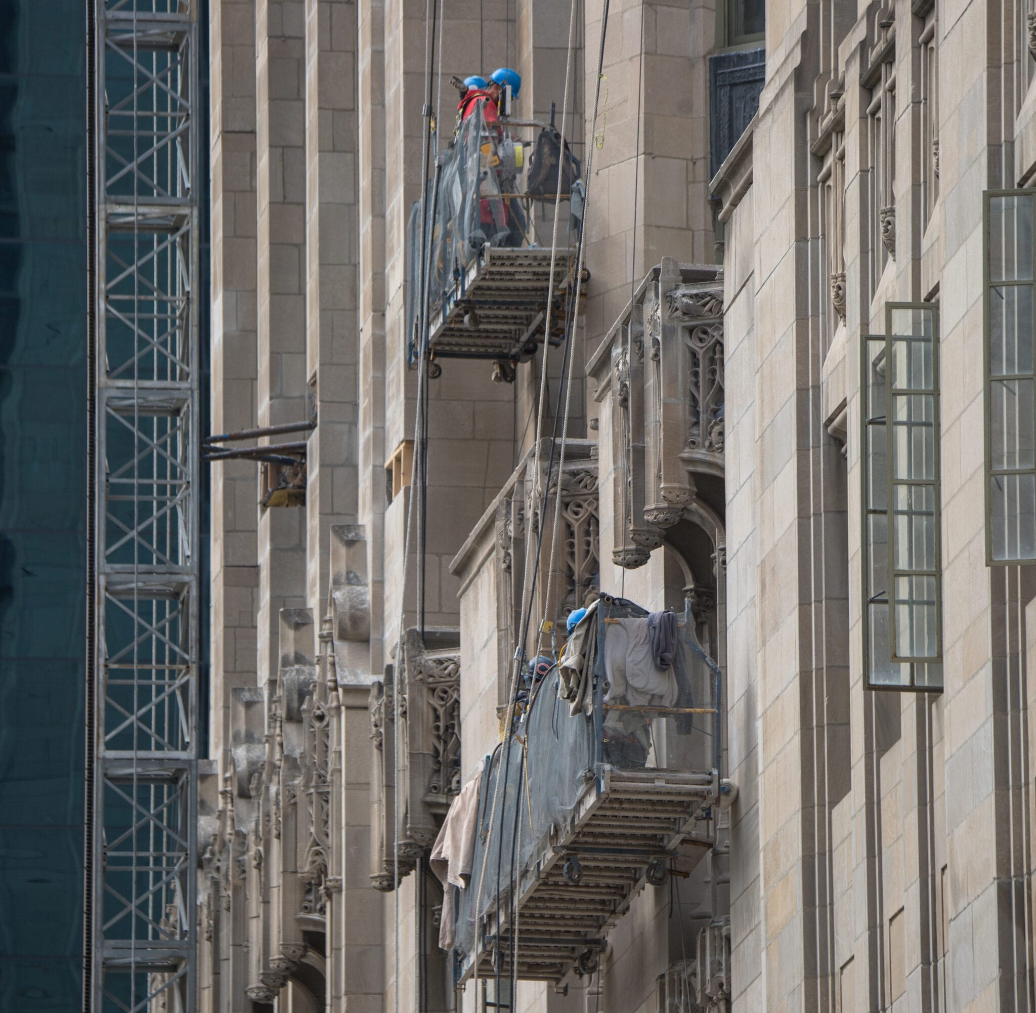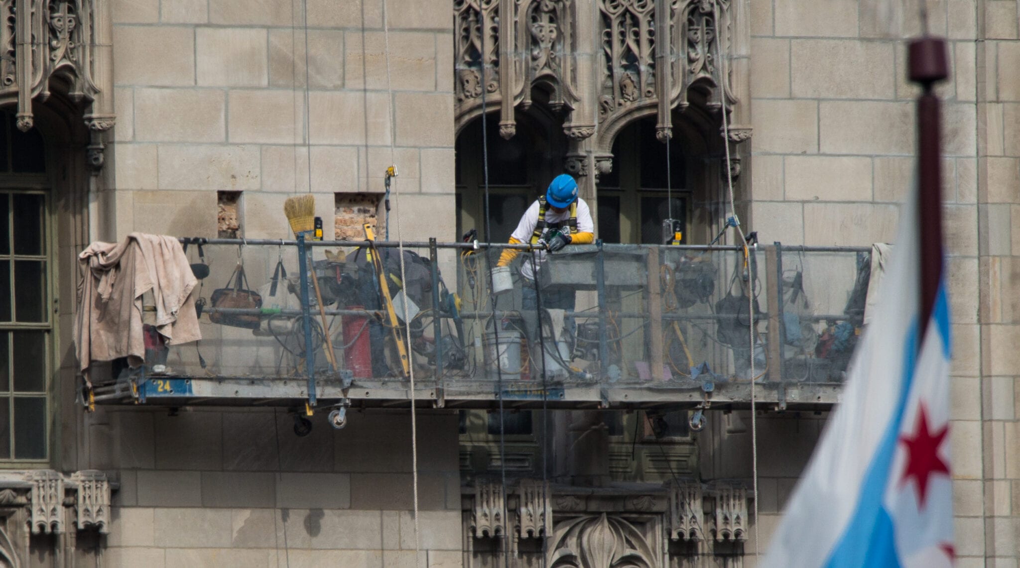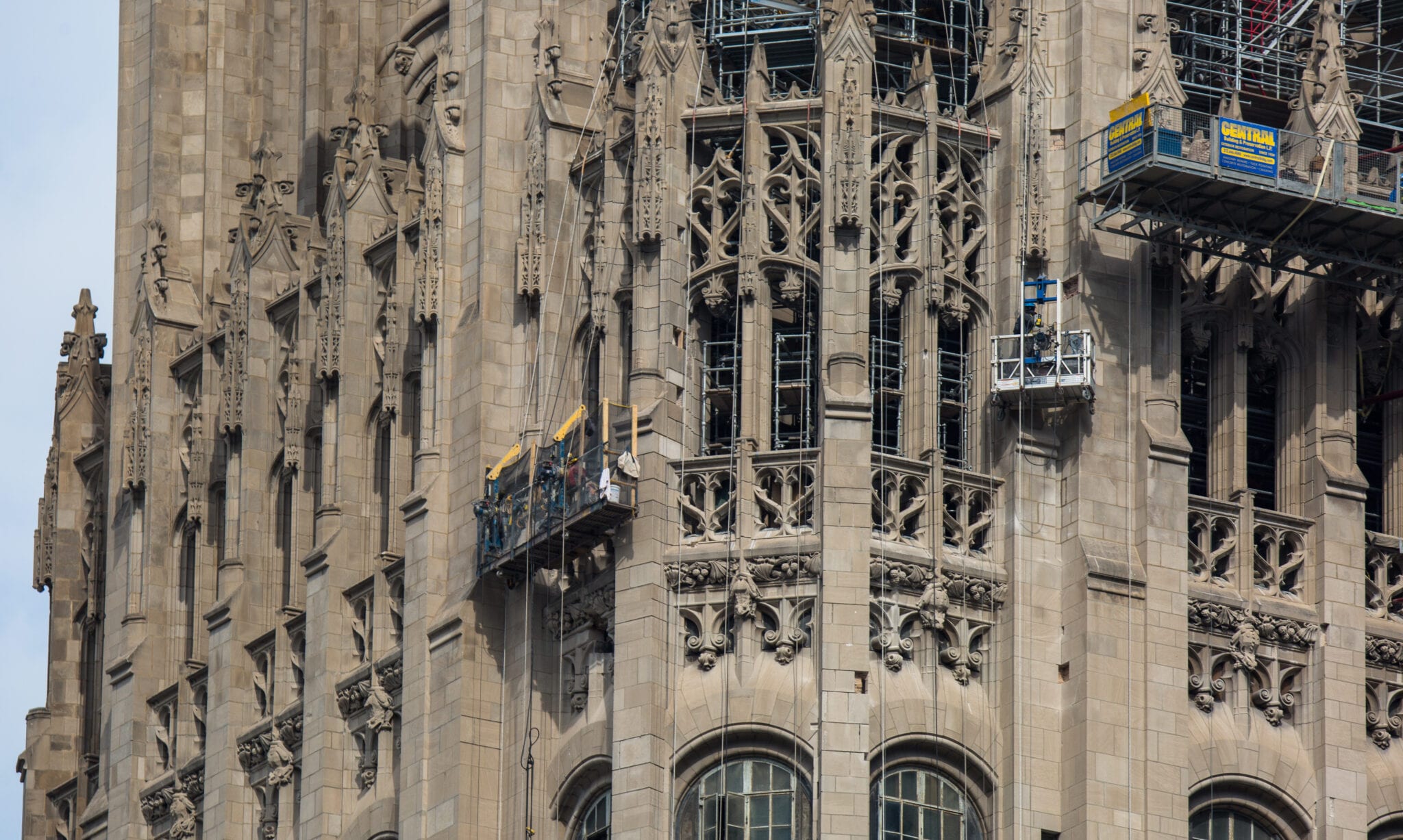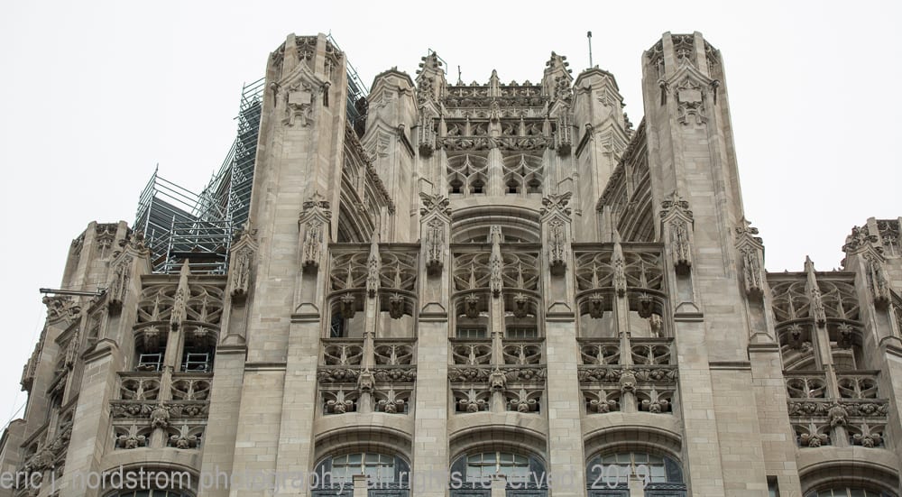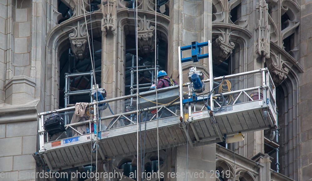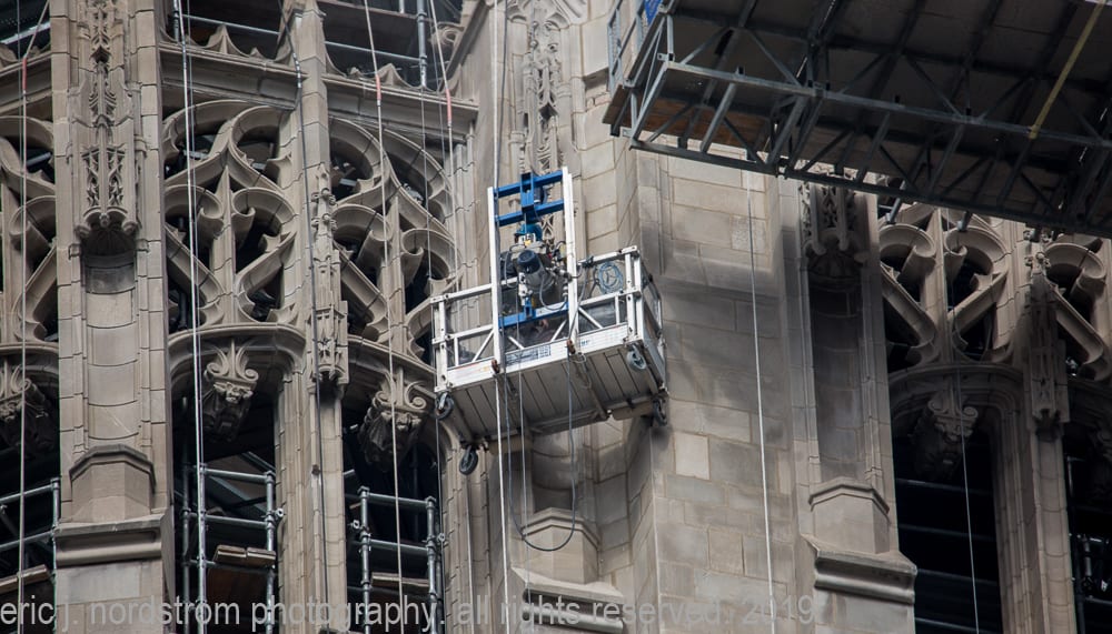 latest photographic images from ongoing restoration of howells and hood’s tribune tower (1925) and partial demolition of jarvis hunt’s printing plant (1929). the majority of the images focus on capturing tradesmen restoring the tower’s bedford limestone from their swing stages hanging off the facade like spiders in a web.