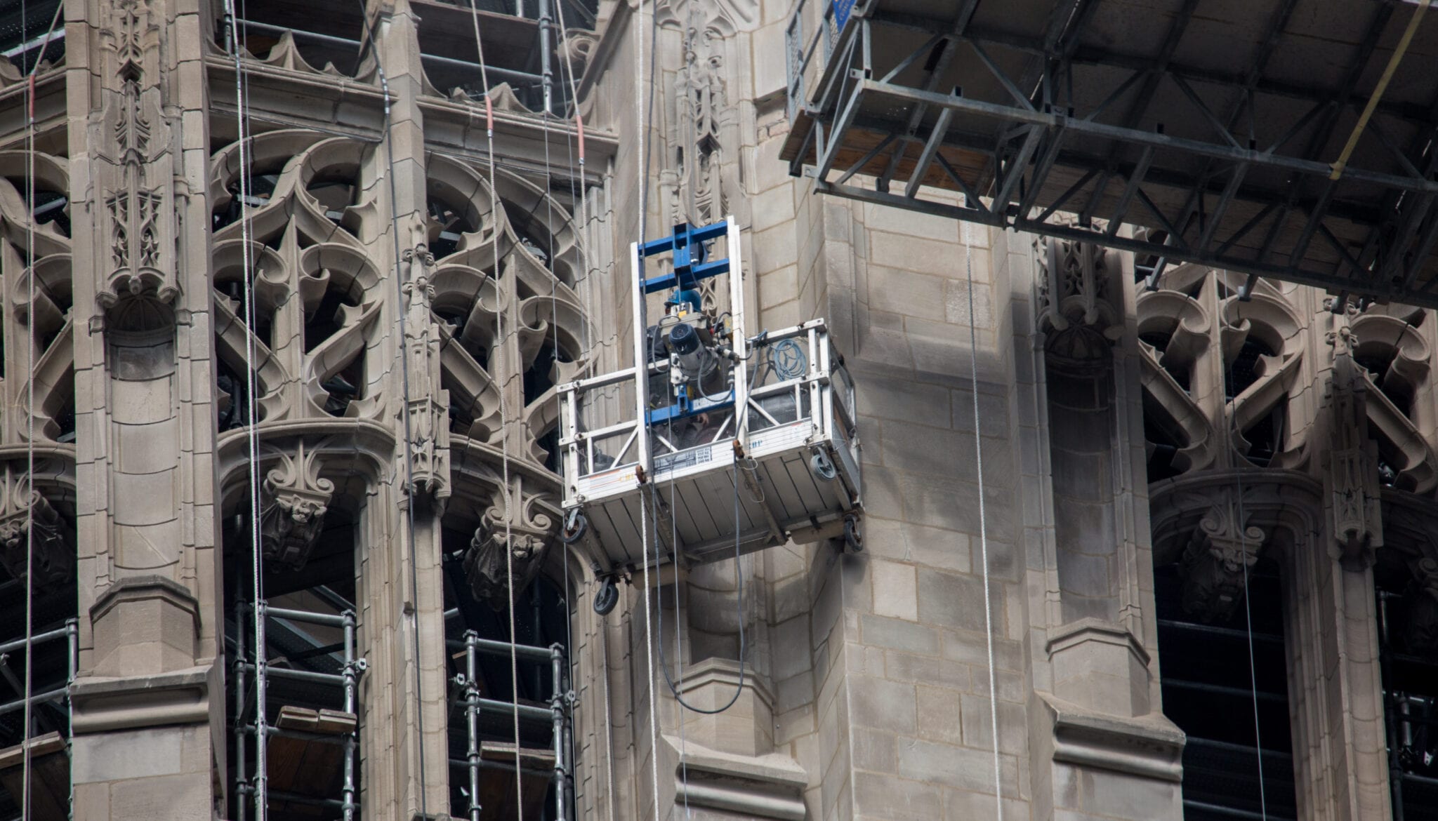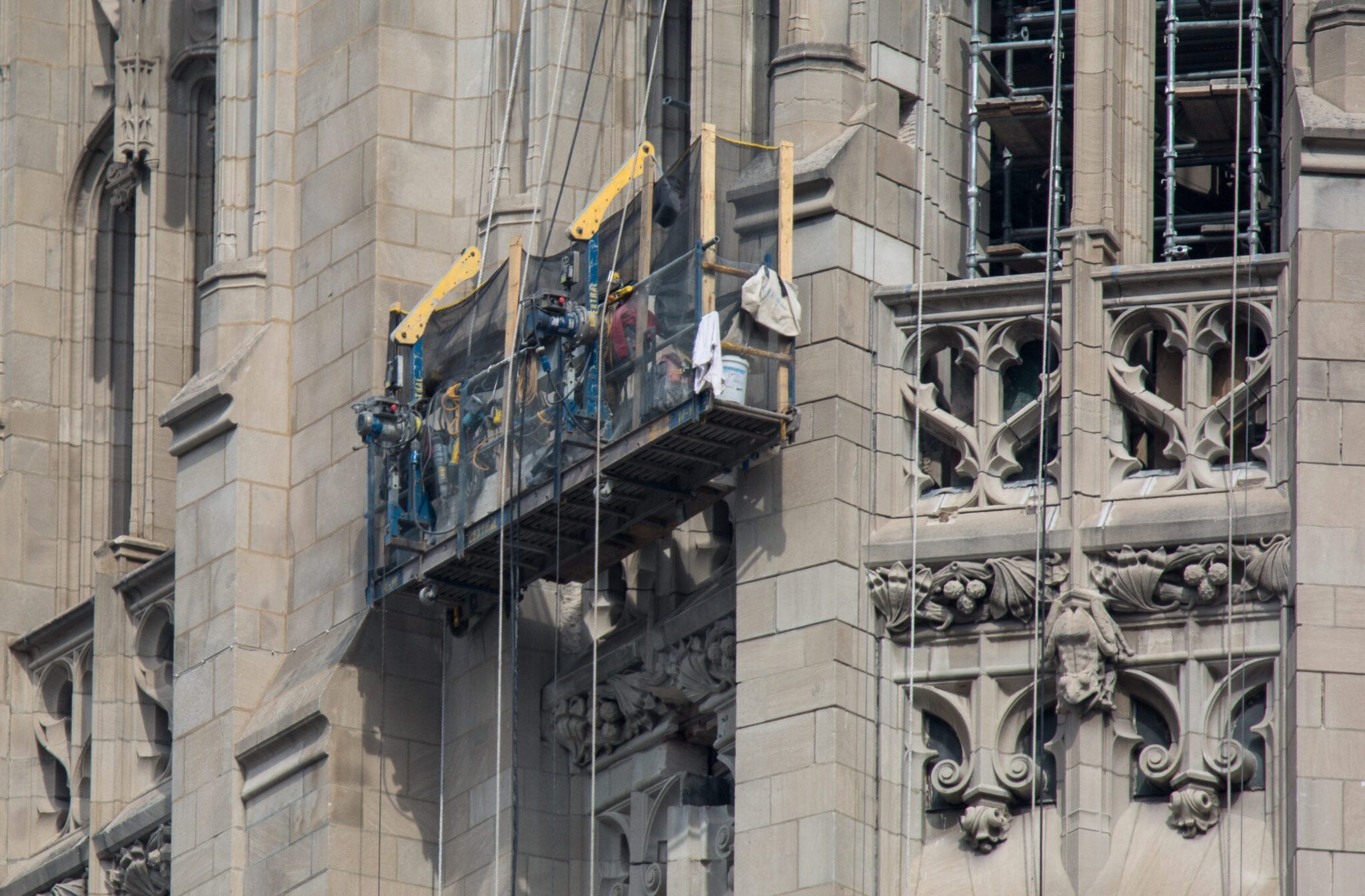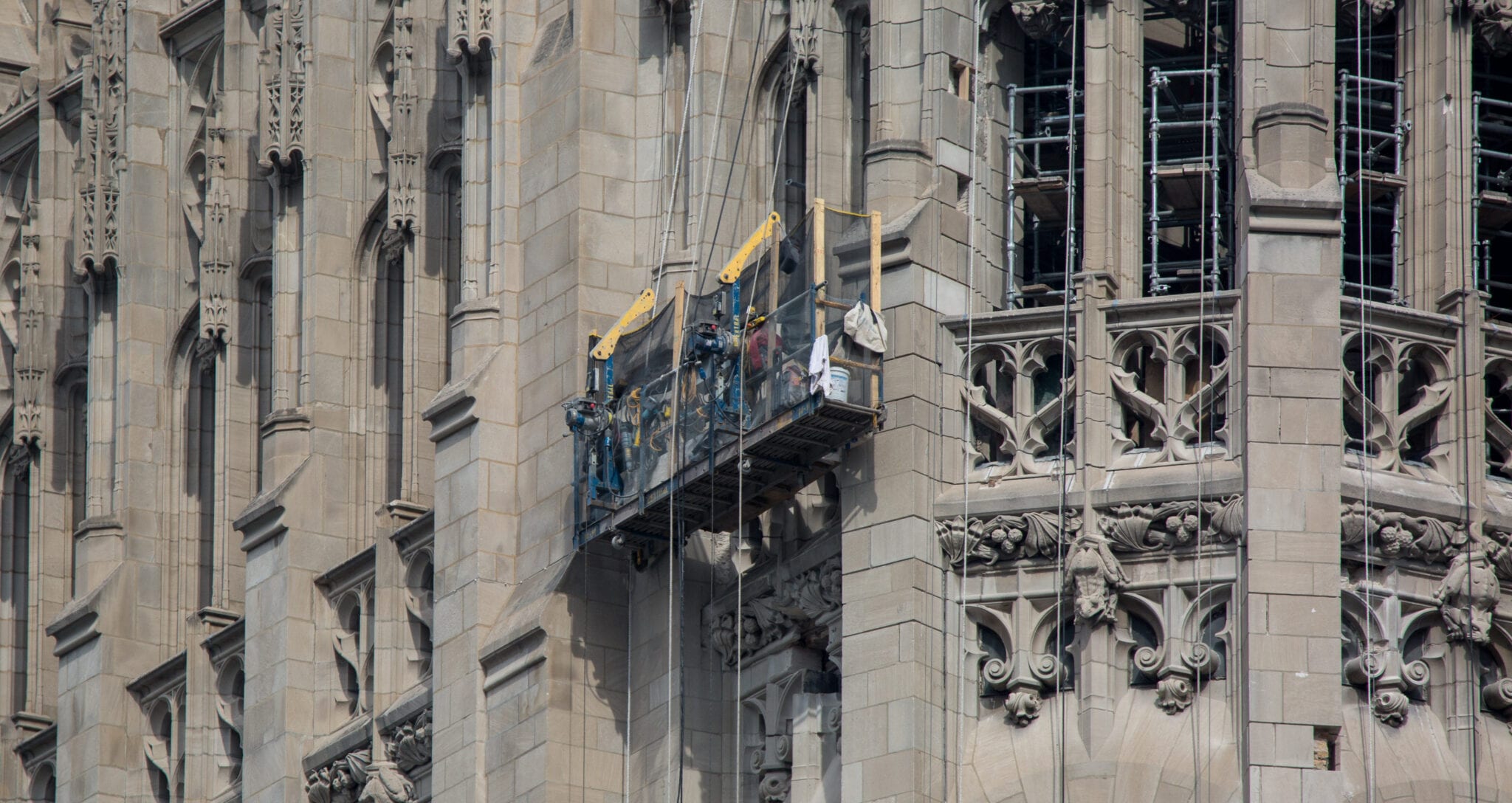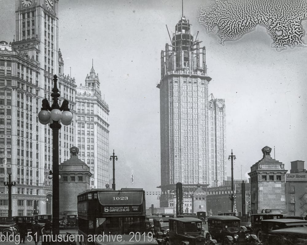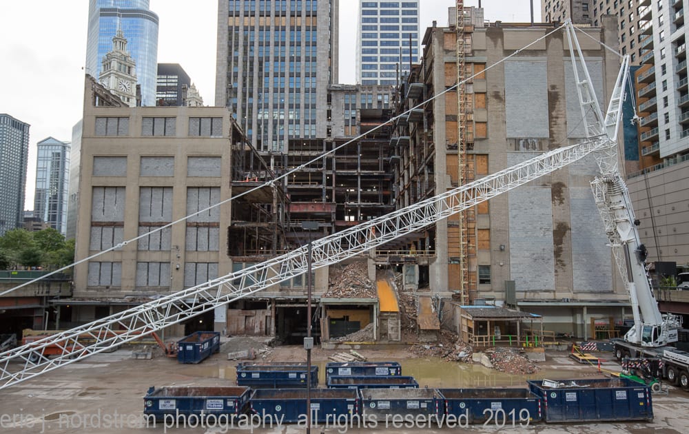 latest photographic images from ongoing restoration of howells and hood’s tribune tower (1925) and partial demolition of jarvis hunt’s printing plant (1929). the majority of the images focus on capturing tradesmen restoring the tower’s bedford limestone from their swing stages hanging off the facade like spiders in a web.