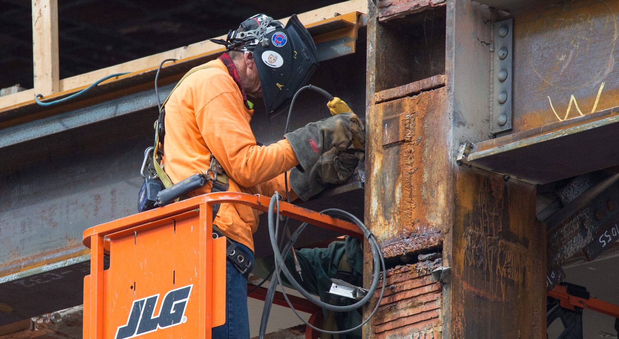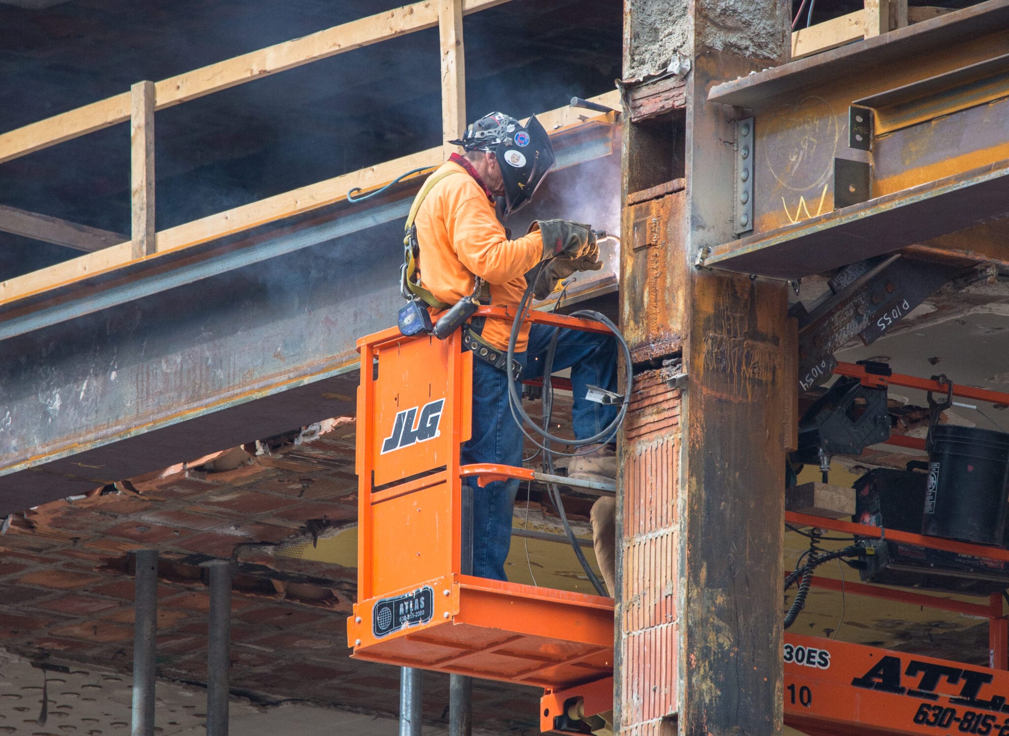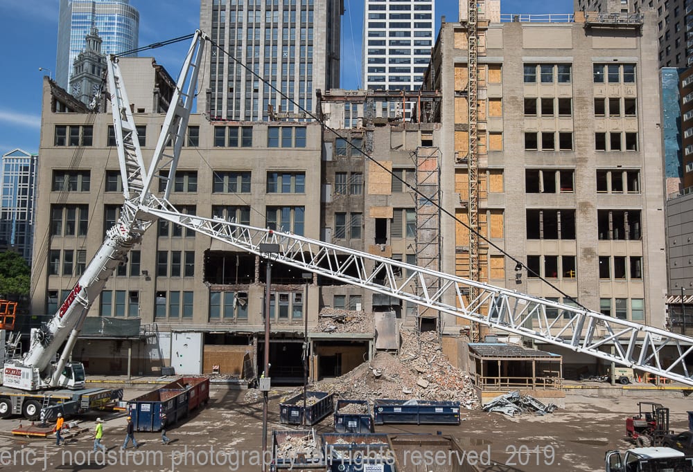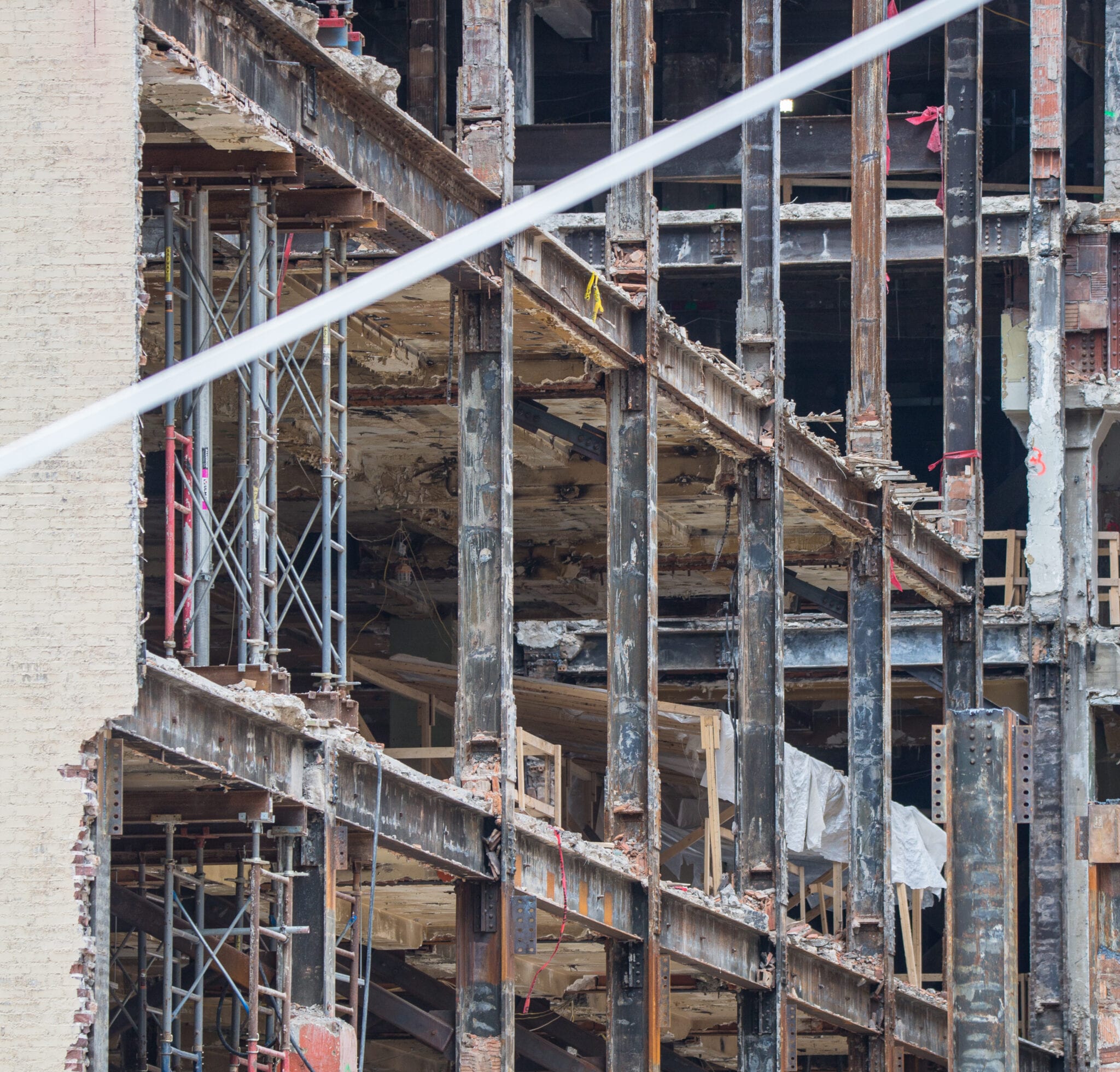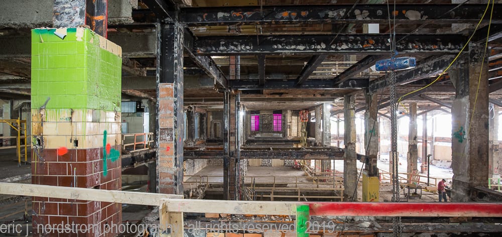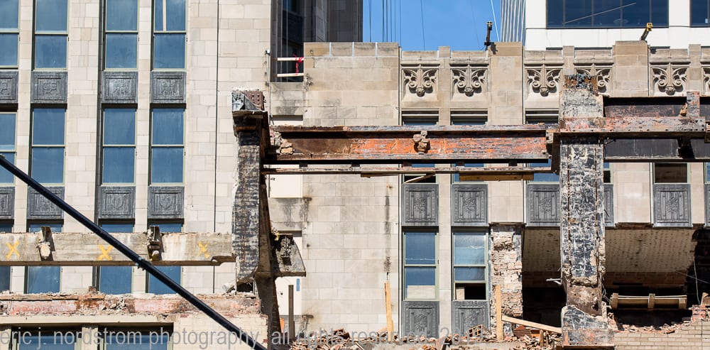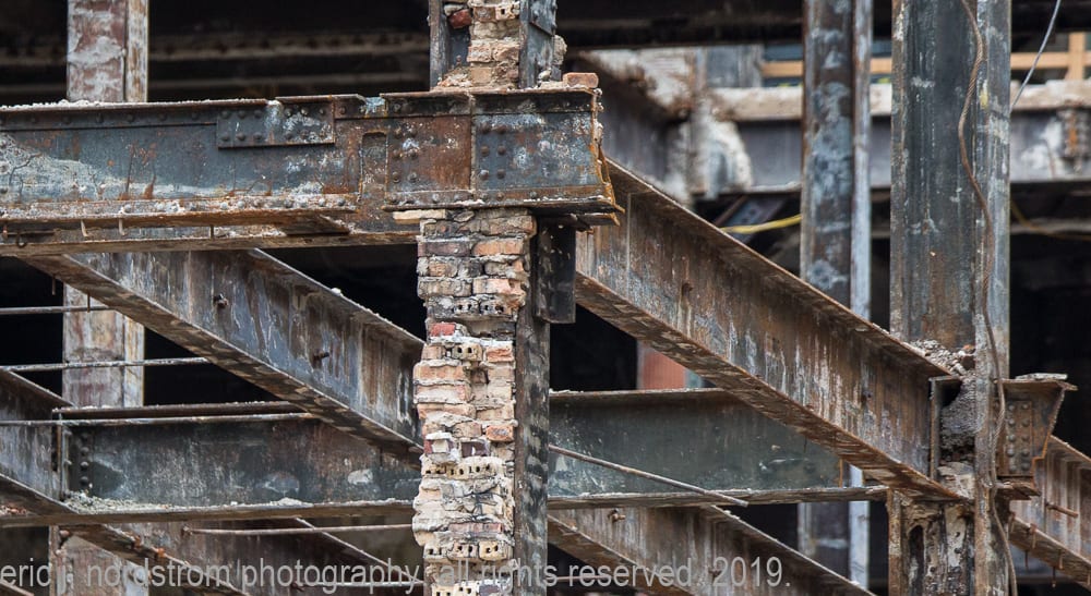 at the same time, i’m tracking progress of the partial demolition of hunt’s 1929 printing plant with detailed shots of the exposed steel skeletal framing (e.g., riveted joint steel columns and beams) originally supplied by the american bridge company in gary, indiana. through repeated visits, i’ve noticed the gradual erasure and/or reconstruction of the building that once housed the gargantuan printing presses. little by little its skeletal remains appear to be destroyed and discarded.