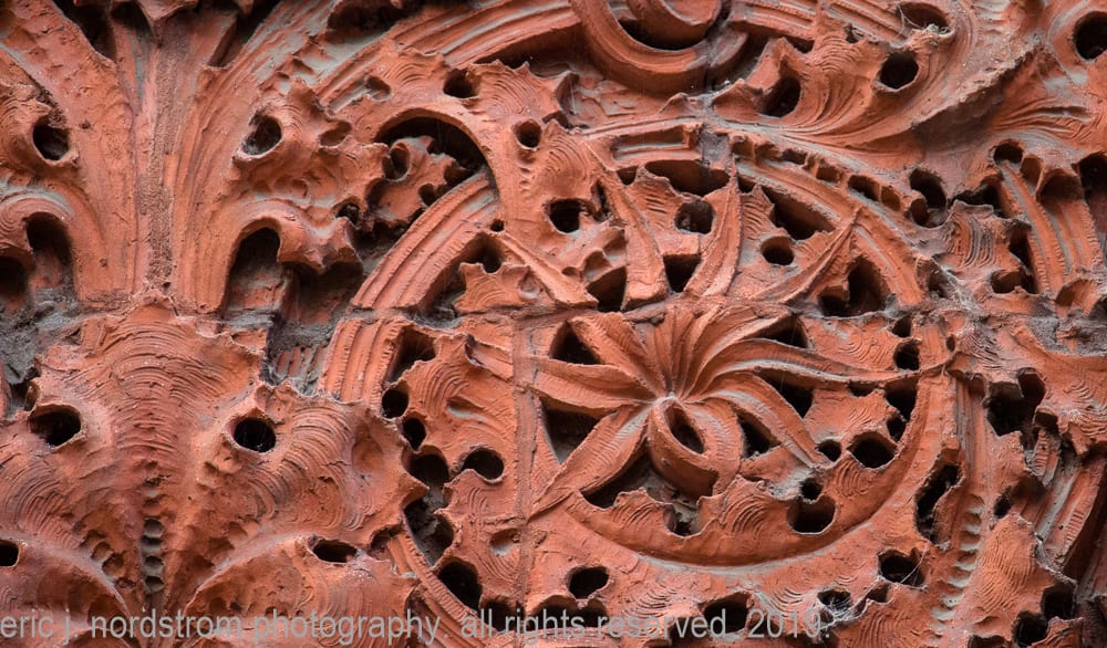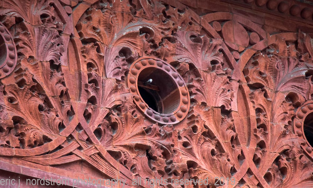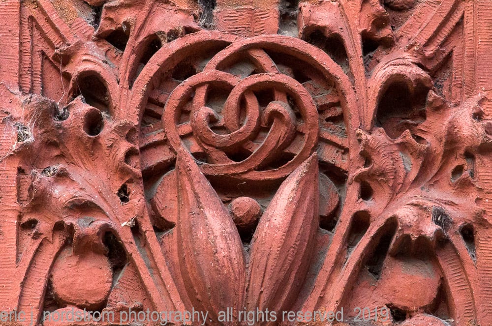 detailed image ornamental red terra cotta on the spandrels, piers, oculus windows, and cornice of adler and sullivan’s wainwright building (1891). the terra cotta ornament was fabricated by the winkle terra cotta company, st. louis, mo. image taken by richard nickel.