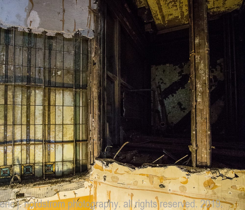 update: shortly after completing my photographic survey of the upper floors i noticed the prairie style leaded art glass windows that were added in 1908 when the storefront and lobby were altered to accommodate a drugstore or pharmacy, where partially exposed behind a wall added in the 1950’s when the lobby was last altered. images of this discovery are found below.