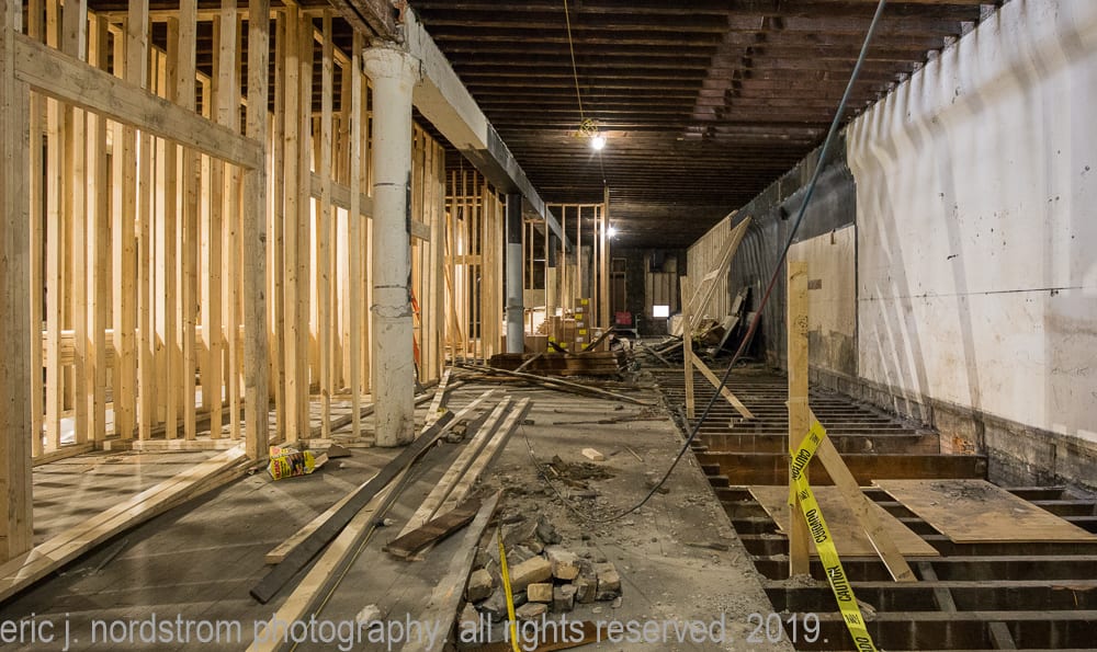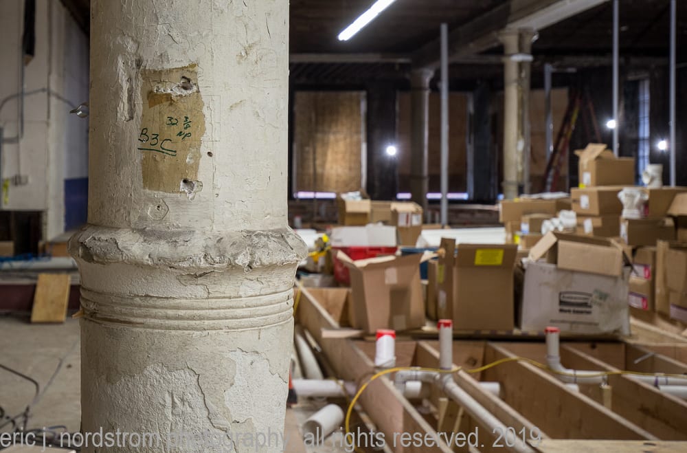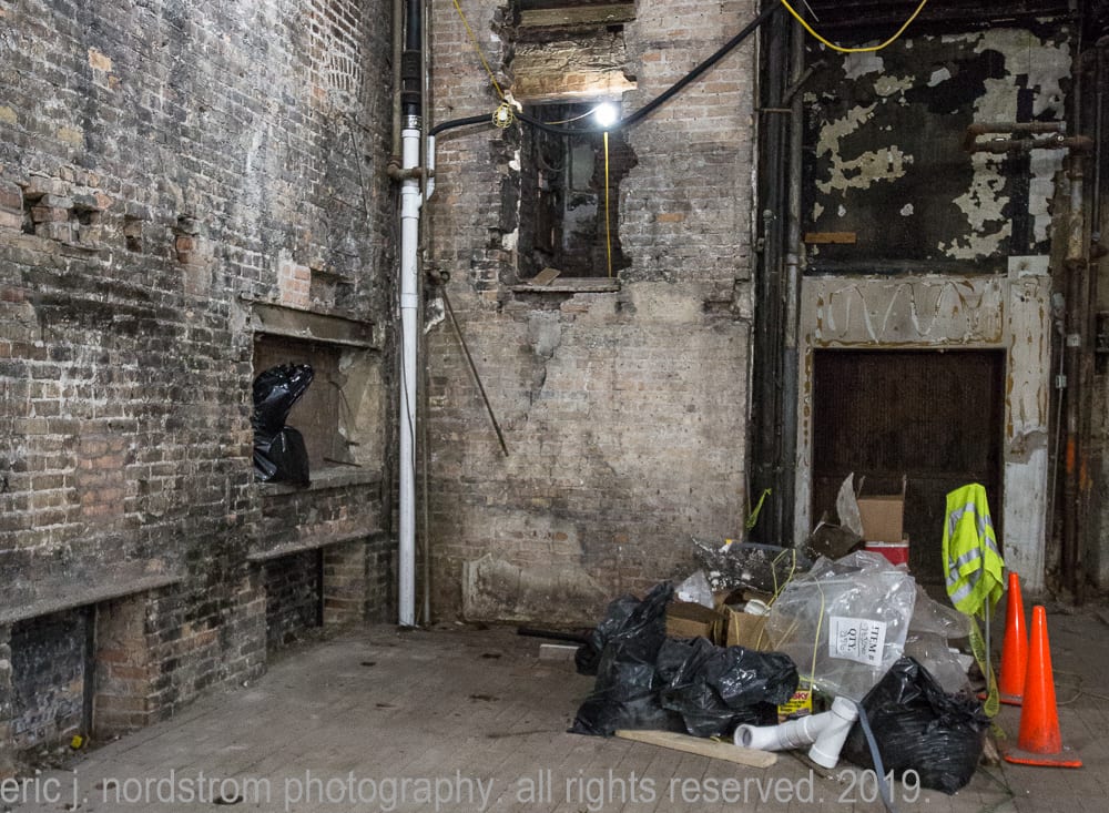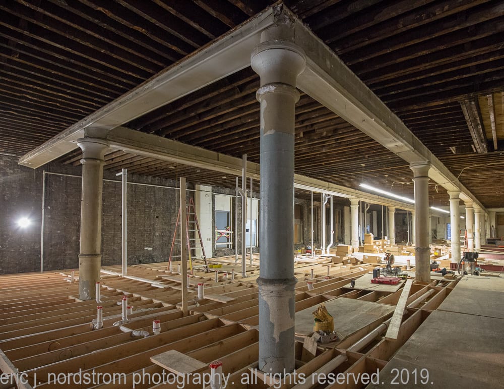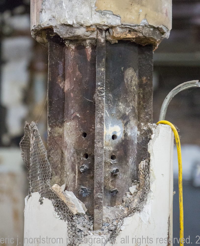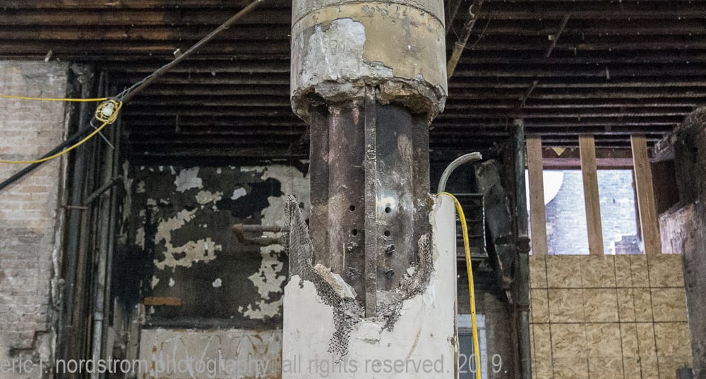 the majority of the images were taken in late september and early october, when tradesmen were busy framing and/or building stud wall partitions and making preparations for beginning stages of rough plumbing. in addition, i took advantage of documenting exposed materials and methods dating back to the time the adler and sullivan building was erected in 1881. i carefully recorded joists, load-bearing posts and beams (both cast iron and wood), fire-proofing in the form of concrete fill between the pine wood sub-floor and solid birch wood finish floor, and interlocking p.b. wight fireproof hollowed terra cotta tiles found wrapped around the flanged cast iron columns and horizontal beams. finally, i captured the sullivan-designed cast plaster columns located on the third floor.