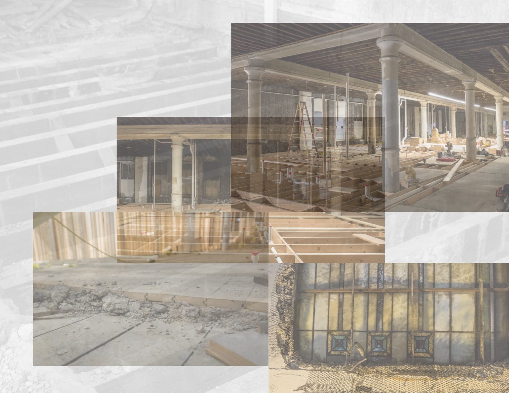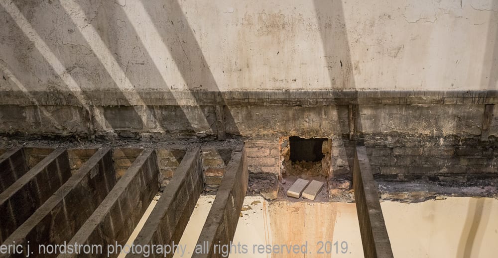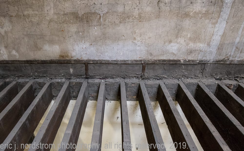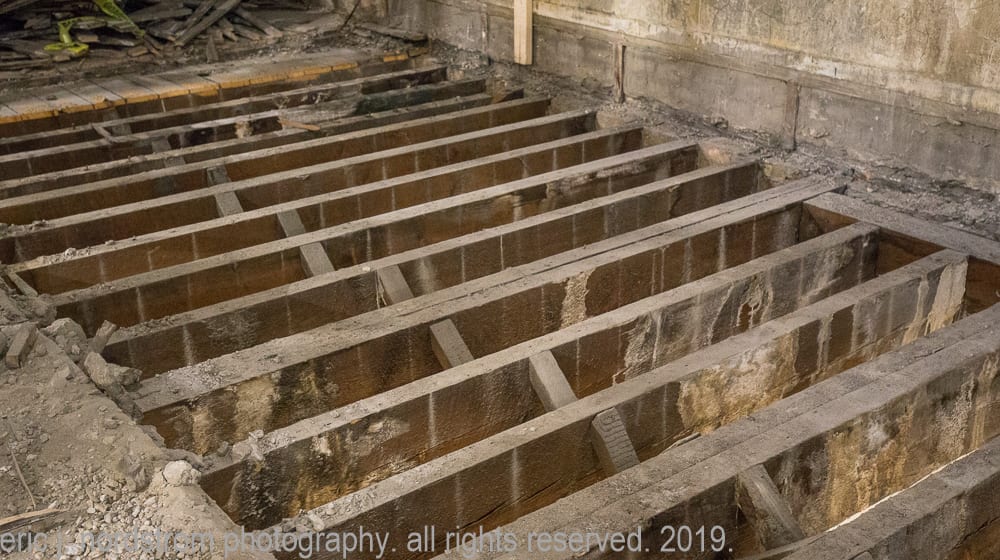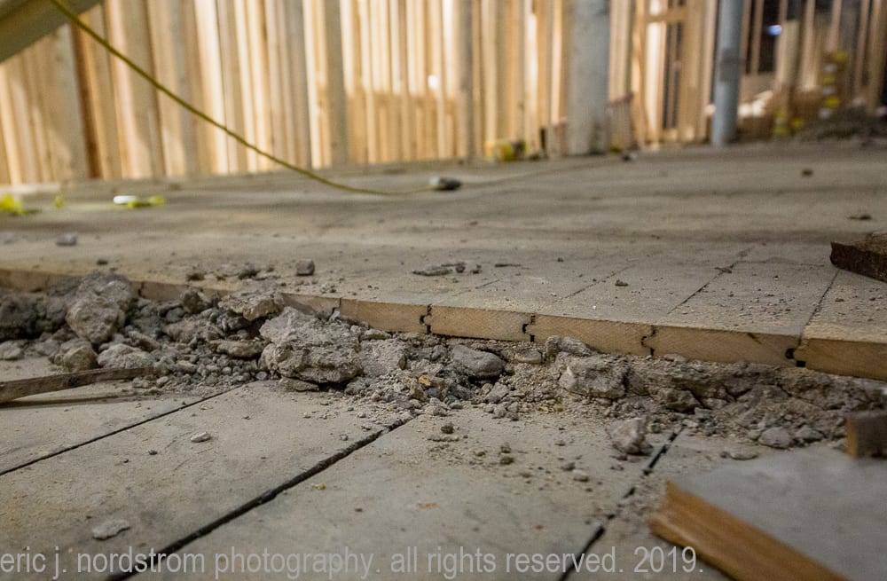 the majority of the images were taken in late september and early october, when tradesmen were busy framing and/or building stud wall partitions and making preparations for beginning stages of rough plumbing. in addition, i took advantage of documenting exposed materials and methods dating back to the time the adler and sullivan building was erected in 1881. i carefully recorded joists, load-bearing posts and beams (both cast iron and wood), fire-proofing in the form of concrete fill between the pine wood sub-floor and solid birch wood finish floor, and interlocking p.b. wight fireproof hollowed terra cotta tiles found wrapped around the flanged cast iron columns and horizontal beams. finally, i captured the sullivan-designed cast plaster columns located on the third floor.