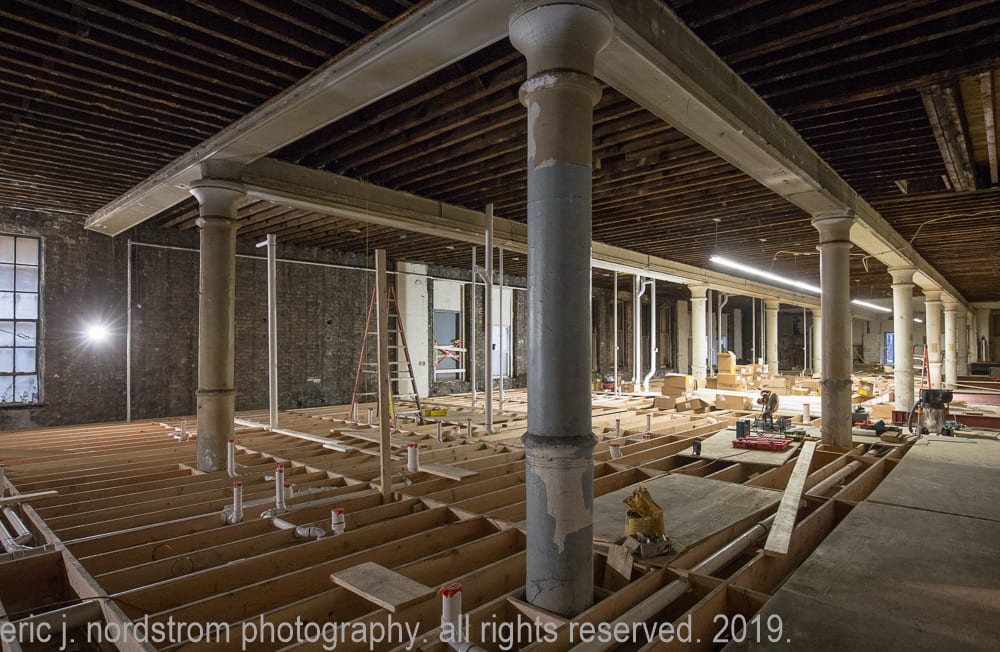 the most recent interior photographic images chronicling the transformation of the s.a. maxwell loft building’s upper floors into livable spaces are found below. at this stage, the upper floors are virtually unrecognizable when compared to images taken by richard nickel in the 1960’s and myself shortly before interior demolition commenced in preparation for its new life as a boutique hotel, where a multitude of rooms will occupy the upper three floors.
