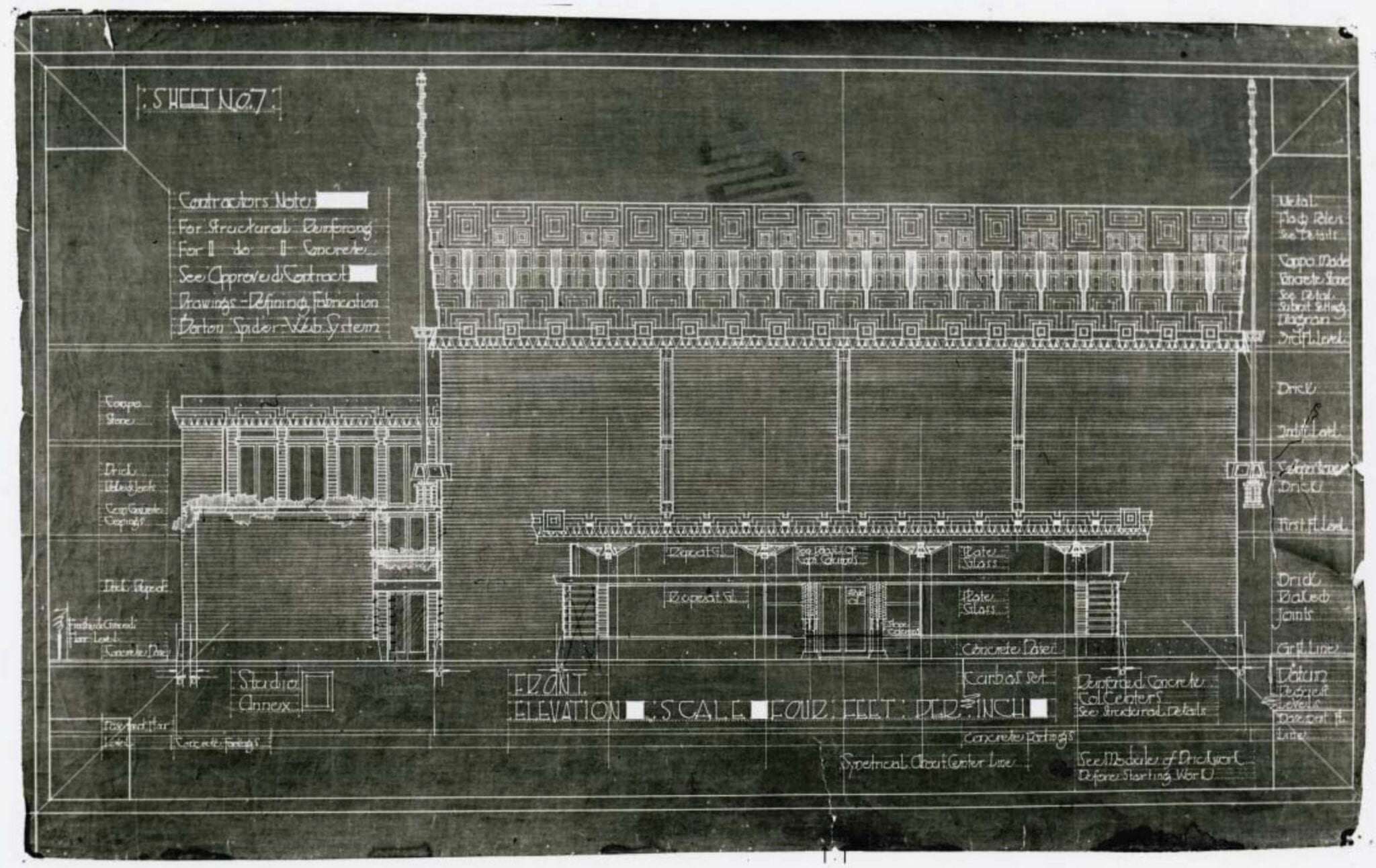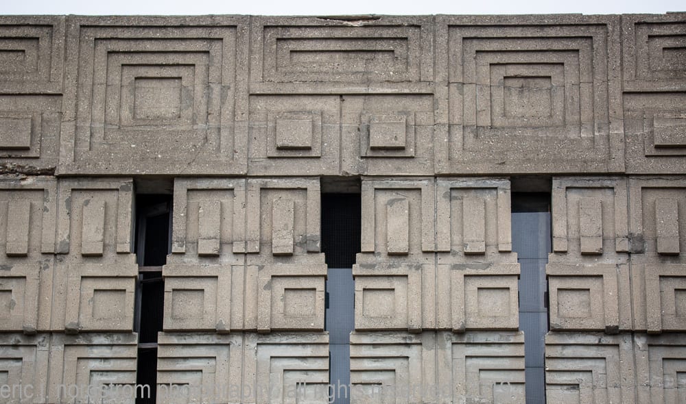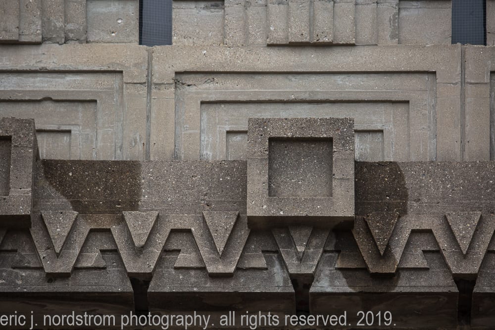 the strongly geometric, mayan-revival style three-part frieze panels were erected by concrete poured into wooden molds set into place. double-scaffolding was required to transport concrete to fill the molds using wheelbarrows from start to finish.