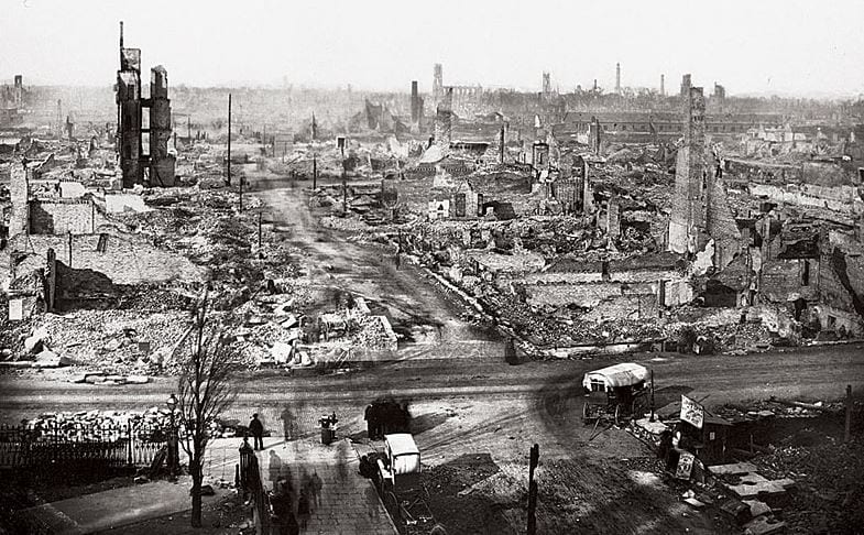 “…this seething ocean of fire, fanned by a hurricane, and fed by the homes and household treasures of a hundred thousand people, everything dissolved—the flames flashing across a street in tongues, as from a compound blowpipe, would pierce a boasted fire-proof structure, and with the speed of thought cut it from front to rear. iron columns melted at the touch, and flamed away in lava to the basement, followed in a crash by the superstructure. marble crumbled into dust, granite swelled with the heat and exploded. limestone flew into fragments, and the fire-proof theories of years vanished in an hour…” – dr. w.b. may, chicago, november 17, 1872.