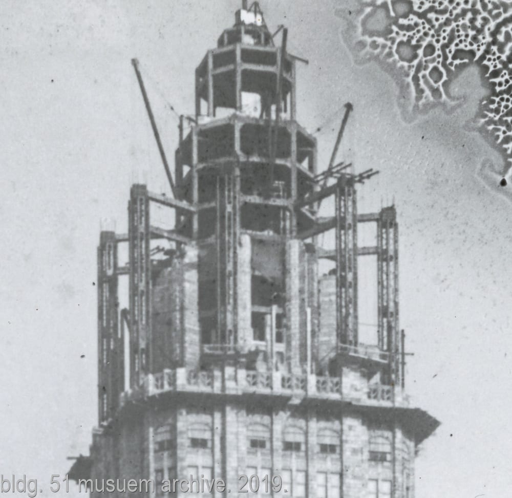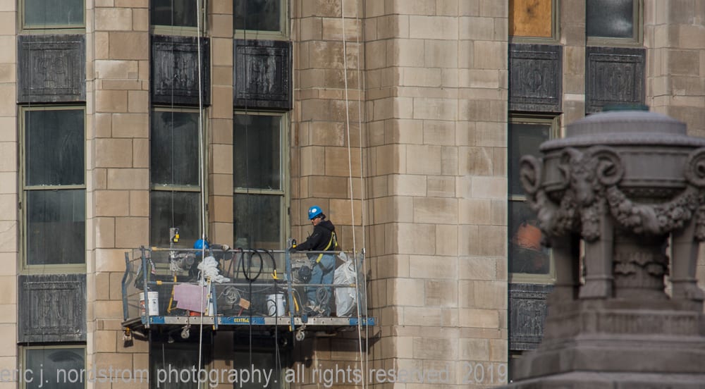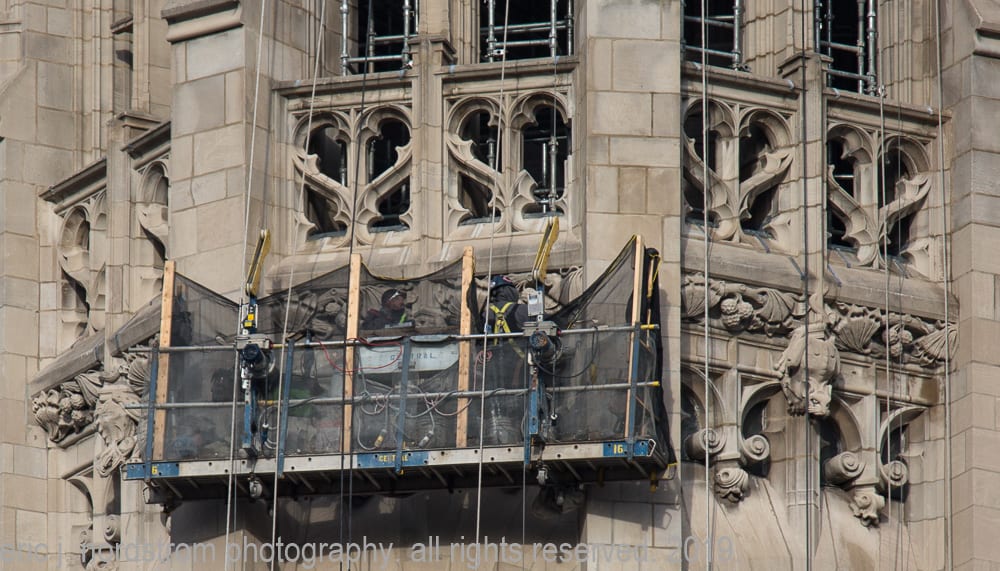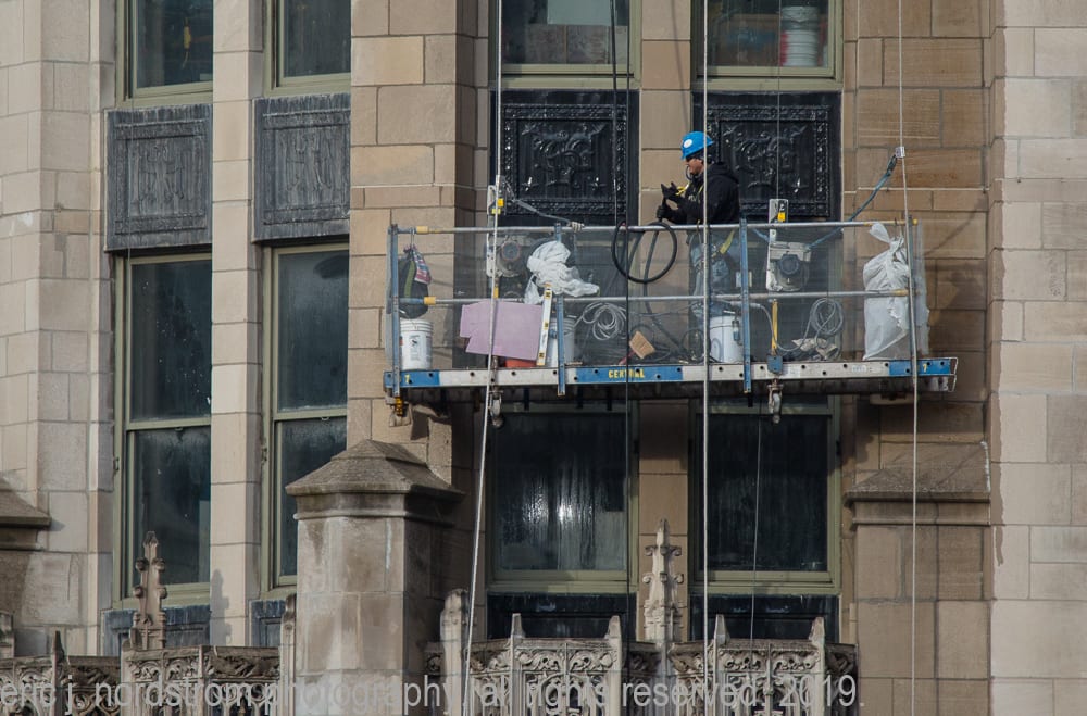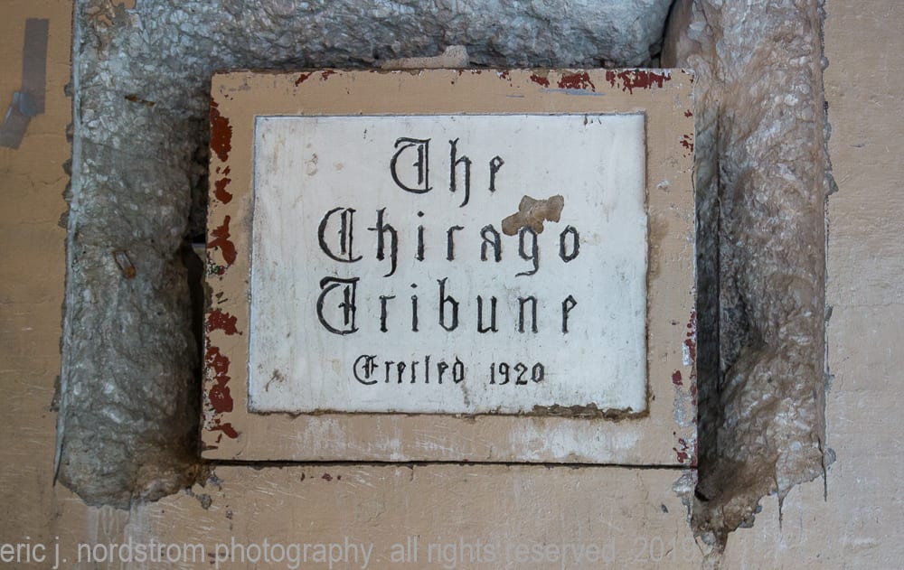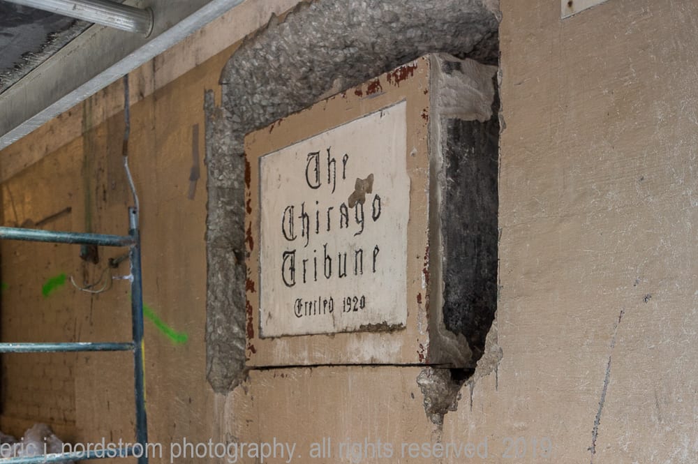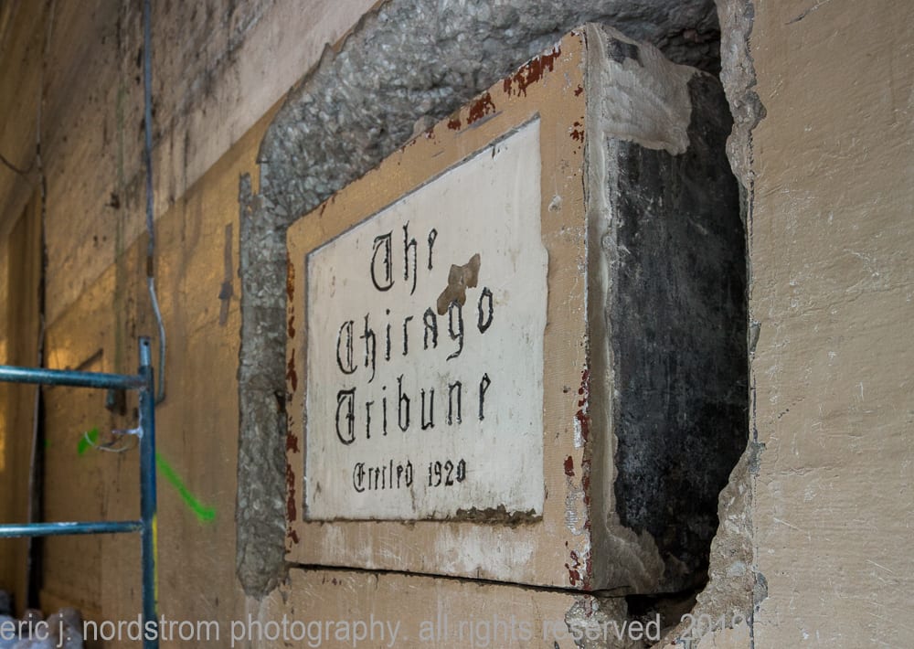 latest photographic images from ongoing restoration of howells and hood’s bedford limestone tribune tower (1925) and cornerstone extraction of incised limestone cornerstone with time capsule from jarvis hunt’s printing plant (1929). the majority of the images focus on capturing tradesmen restoring the tower’s bedford limestone from their swing stages hanging off the facade like spiders in a web.