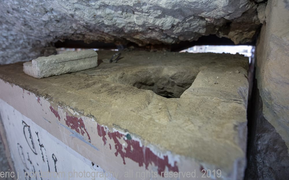 previous images focused on tracking progress of the partial demolition of hunt’s 1929 printing plant with detailed shots of the exposed steel skeletal framing (e.g., riveted joint steel columns and beams) originally supplied by the american bridge company in gary, indiana. through repeated visits, i’ve noticed the gradual erasure and/or reconstruction of the building that once housed the gargantuan printing presses. little by little its skeletal remains appear to be destroyed and discarded. when i last visited what remained of the plant, workers were extracting the corner stone replete with a the single cavity for housing time capsule.