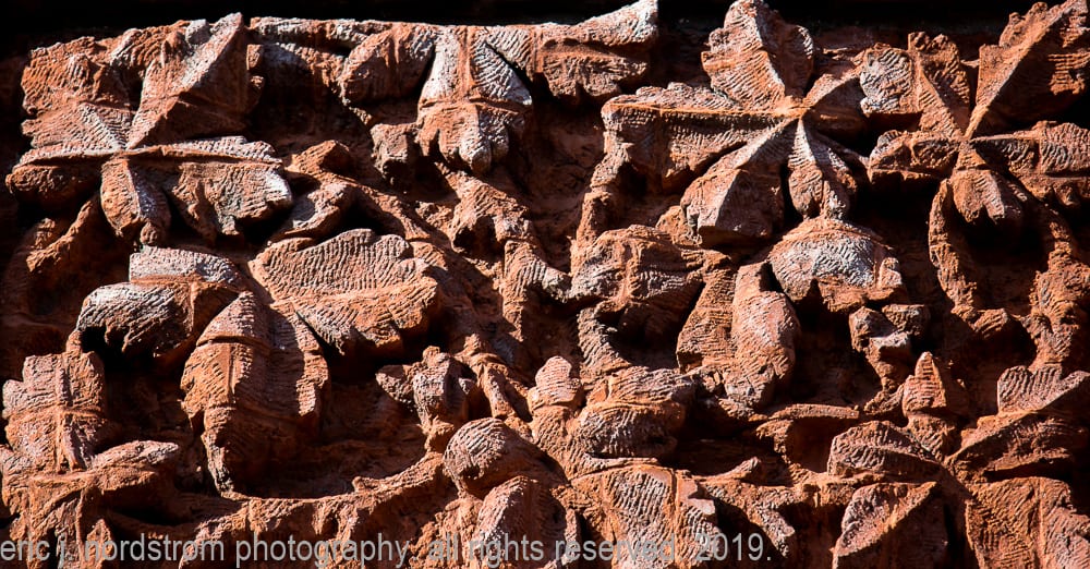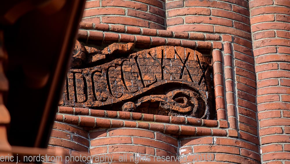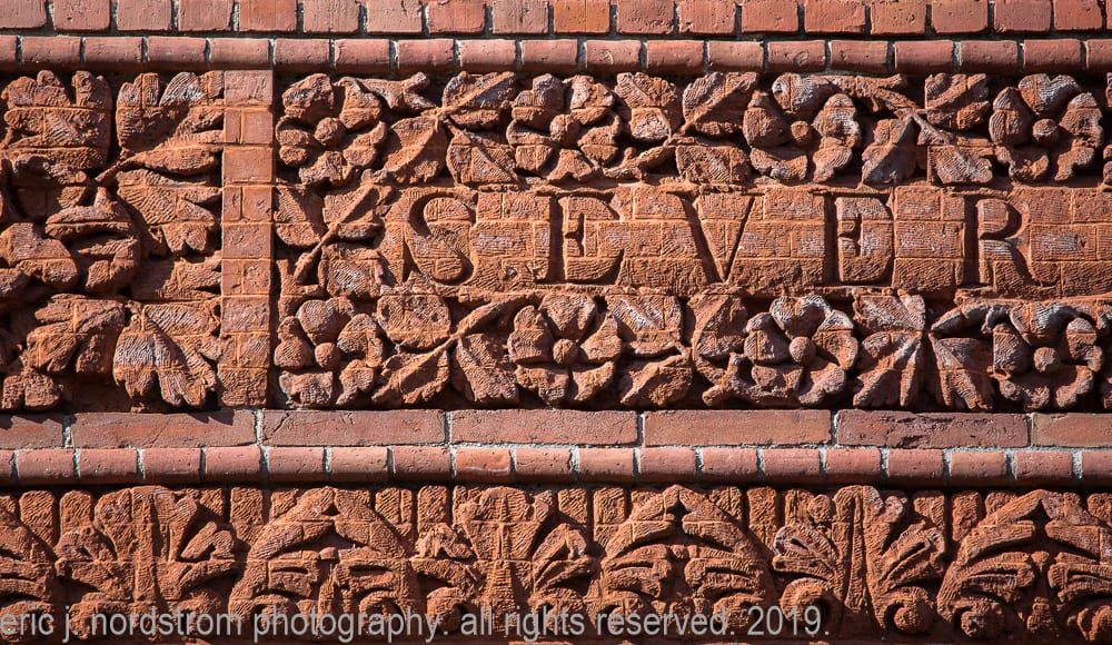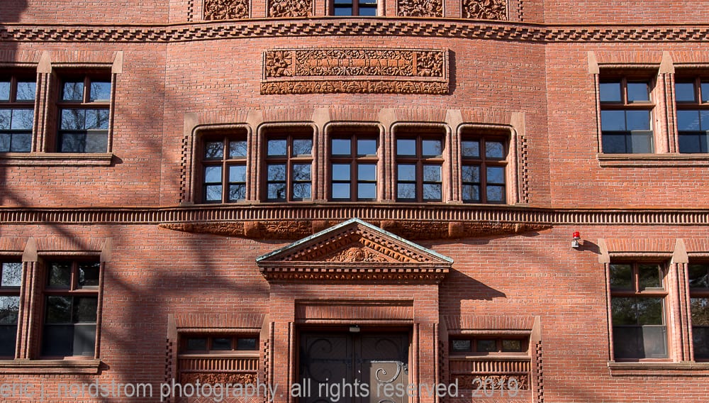 photographic study of h.h. richardson’s sever hall (1878-1880) exterior east facade brick ornament adorning east facade. the richly carved brick ornament was likely executed by the peerless brick company, philadelphia, pa. the 3-story building (4th story set within roof) was constructed using nearly 1.3 million bricks, with around 100,000 used for the facade.