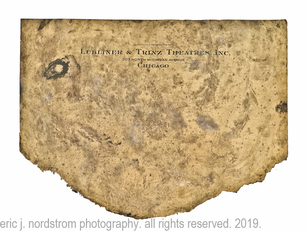 after looking over the images of what i found in the attics, crawlspaces and plenums of five theaters, i can’t help but wonder what i would find in other period theaters around chicago. for a time, i made every effort to access others, but that ship has since sailed – ending instead with the “lost and found” book i published on what was discovered in the congress theater. perhaps someone else can pick up where i left off, if opportunities present themselves. in the meantime, i plan to continue working on what i did find and/or document and create a complete and fully accessible archive that i will donate to interested parties.