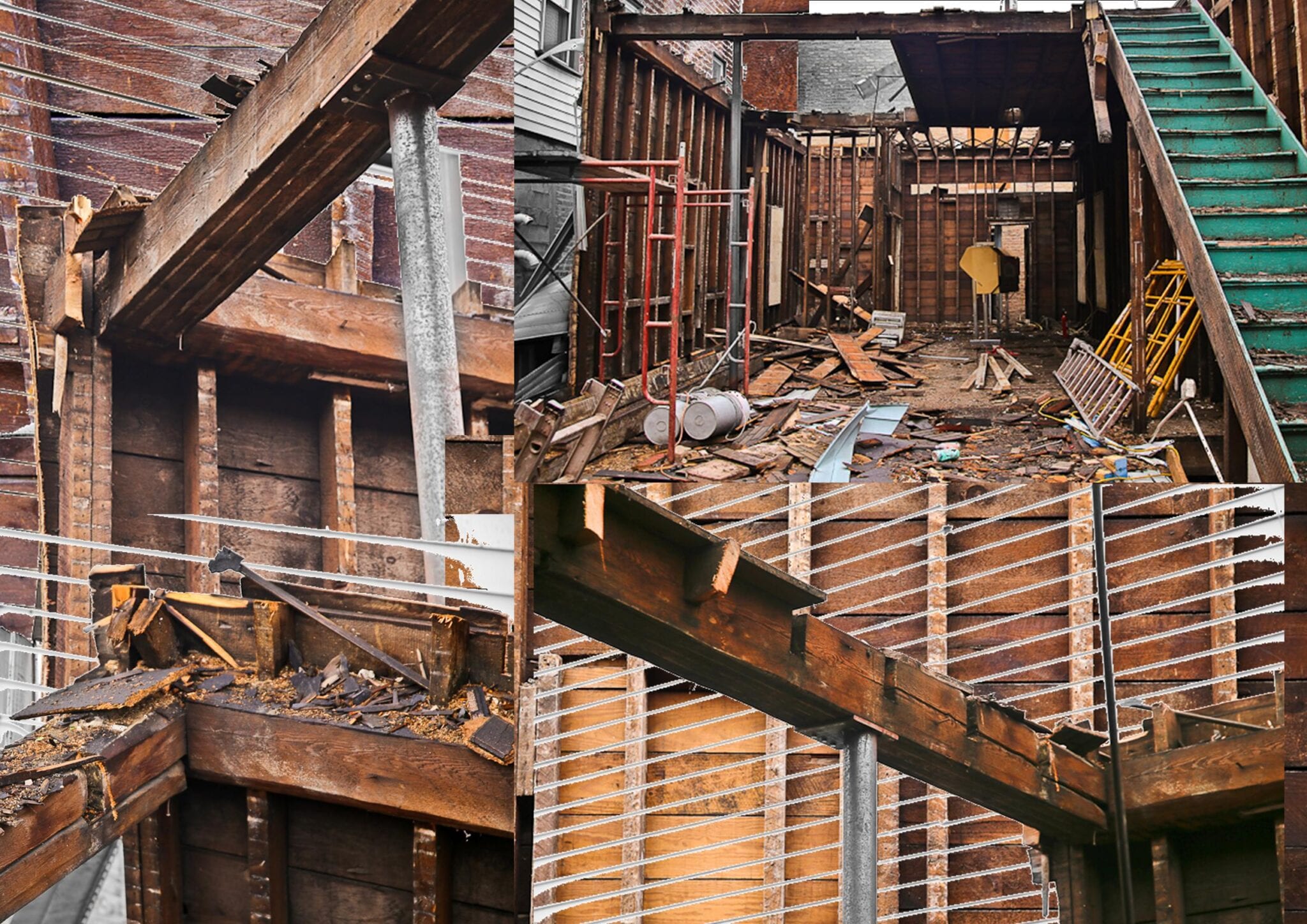 while en route to a demolition in the wicker park neighborhood of chicago, i came across an unusual renovation or demolition, some kind of chaotic project that left the structural components of a 19th century two-story framed cottage fully exposed for both the eye and camera to ponder. after speaking with the “wreckers,” it was made clear that the remaining frame would be taken apart – by hand – and all of the wood carted off to the dump. tabling concern for the latter, i received permission to document what remained of the structure, including several integrated “systems” that were still intact.