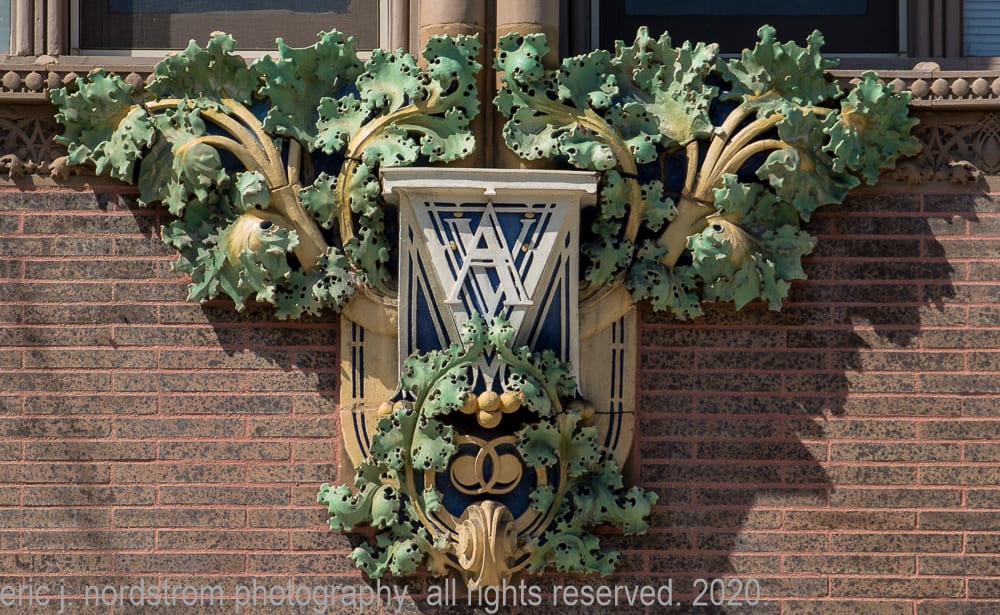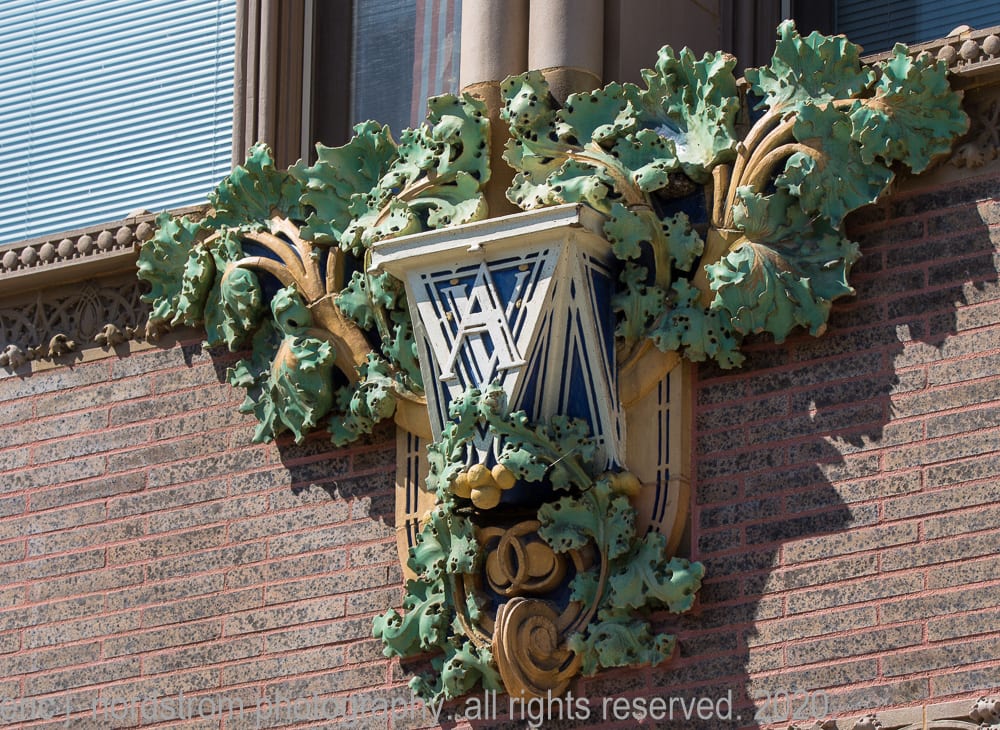 photographic study of louis h. sullivan-designed polychromed terra cotta ornament adorning the van allen building or department store located in clinton, ia. the four-story commercial building was commissioned by john van allen and constructed between 1912-14 as louis h. sullivan as architect.