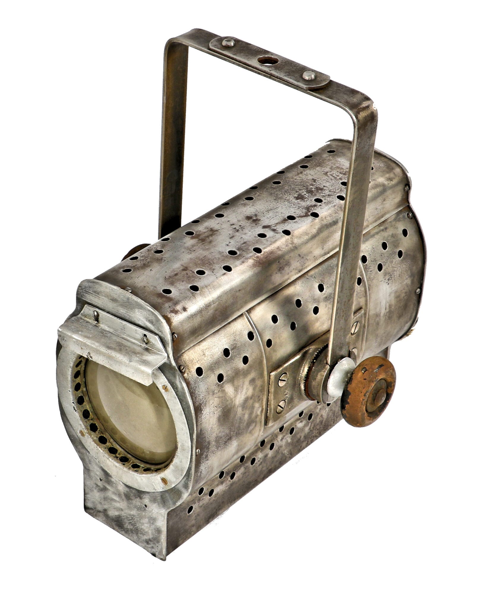 one of many cold-rolled sheet iron original ceiling-mount carbon arc spotlights used to illuminate events held at chicago stadium. the turned wood knob and glass fresnel lens are original.