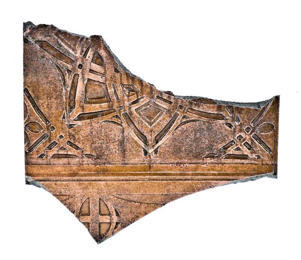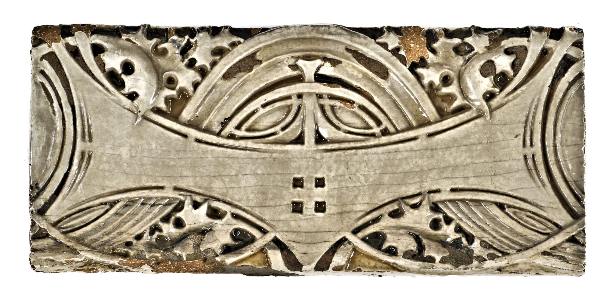 original exterior white glazed terra cotta sill course panel salvaged from the facade of the schlesinger and mayer during one of many restorations. the late 19th century (1899) panel was designed by l.h. sullivan, modeled by christian schneider, and executed by the northwestern terra cotta company, chicago, ills.