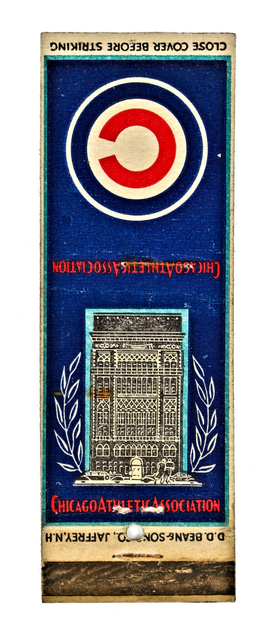 vibrantly colored used matchbook cover with encircled “c” logo (adopted by william wrigley when he acquired the chicago cubs) and cobb’s facade flanked by a laurel wreath.