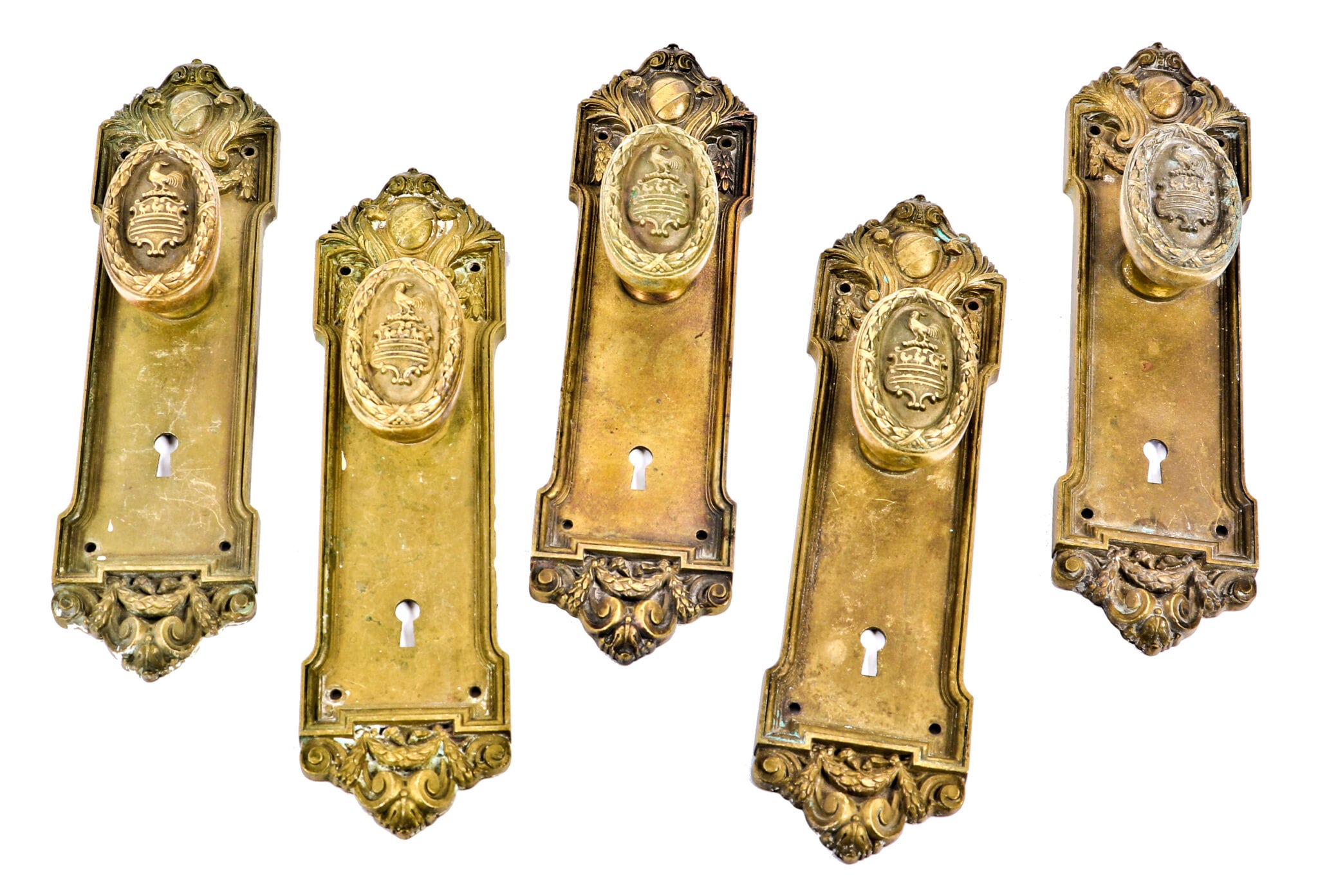 original cast yellow brass guest room door hardware designed specifically for the blackstone hotel. the “rooster” motif is used in the building’s cream-colored exterior terra cotta. fabricated by the yale & towne mfg. co., stamford, ct.