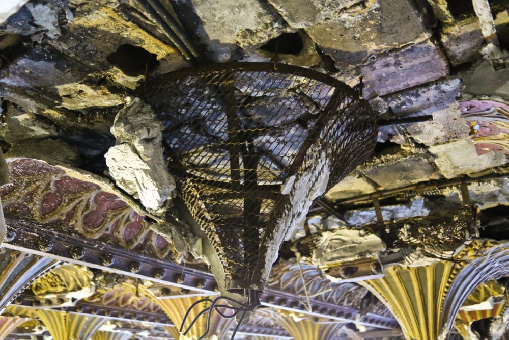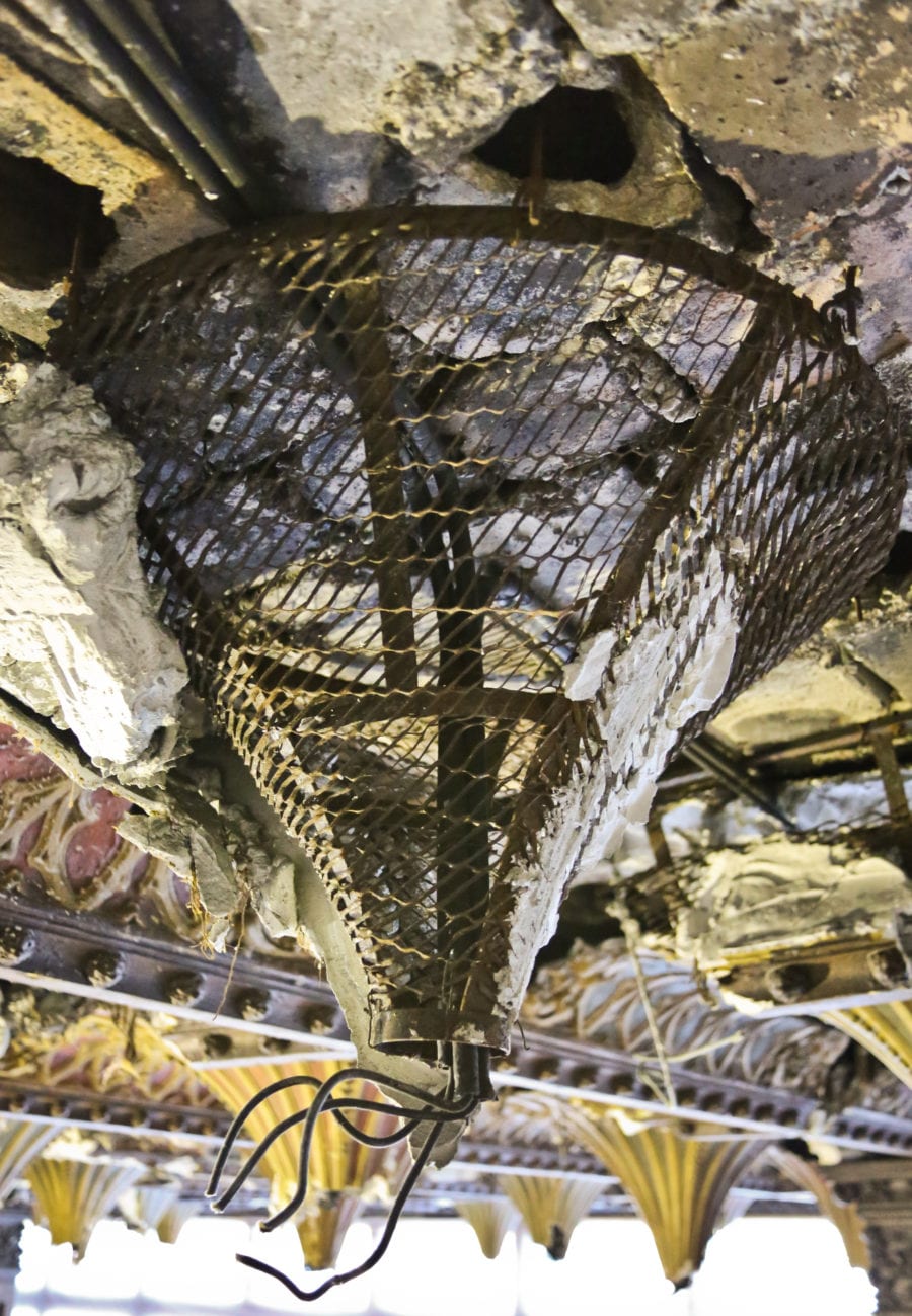 thankfully, i was there to meticulously document the original ceiling once the false ceilings were removed, to capture the unusual anatomy of the original panels – the metal mesh cones and the heavily insulated cloth cords used to electrify the original edison carbon “hairpin” filament bulbs during the late 19th and early 20th century. none of the original brass shell keyless sockets survived the destructive alterations when concealing the ceiling, so i will have to dig into period trade journals to help identify the original lighting system used and the fabricators that would have installed it.