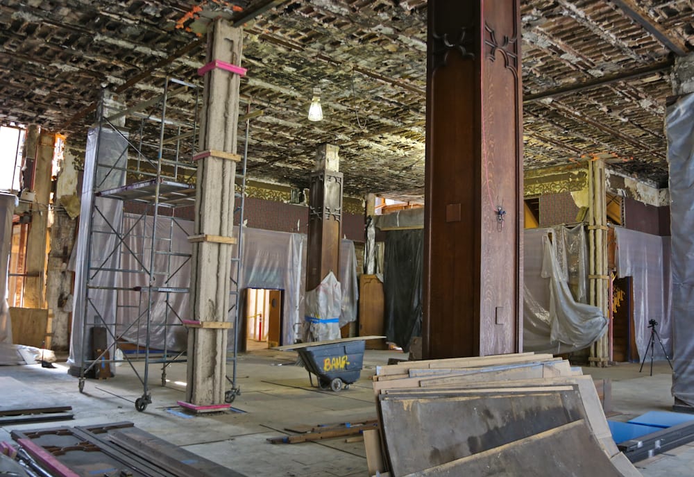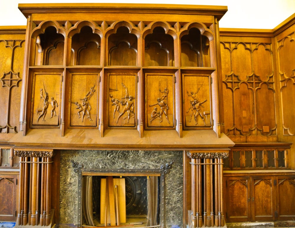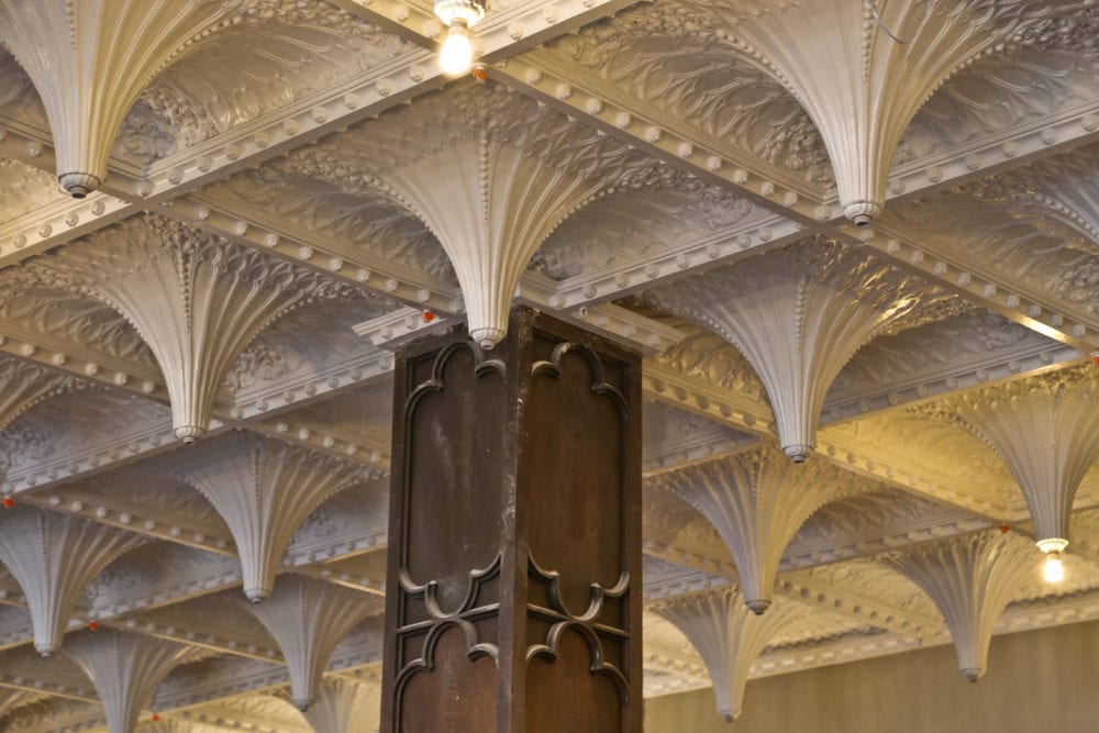 the ornamental ceiling (reconstructed in 2015) is located on the building’s 8th floor, in the spacious (6400 sq. feet) dining room, which like the reading room on the 2nd floor, was finished with quartered oak wood doors, columns, paneling and three gargantuan fireplace mantles replete with intricately carved cabinet doors.