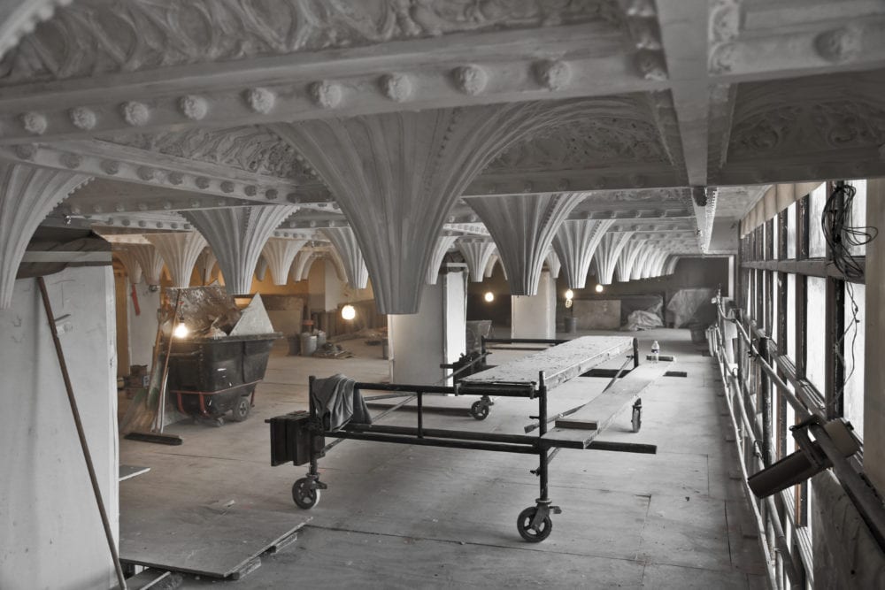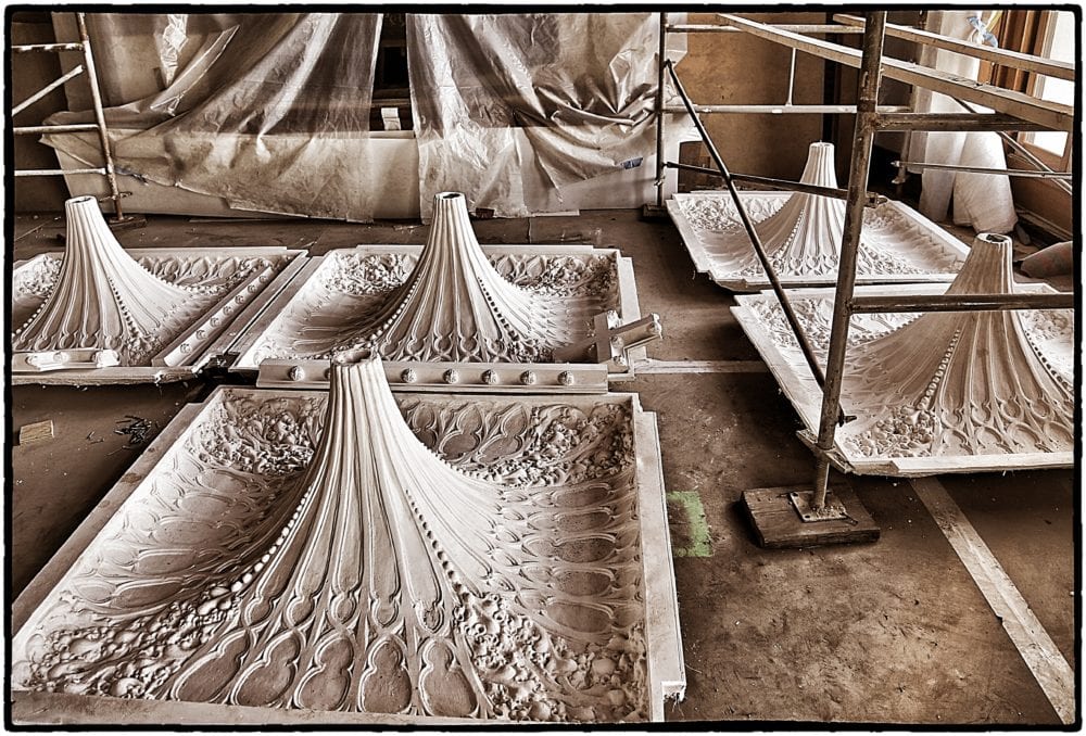 sadly, when the acoustic tile false ceilings were added, perhaps as early as the 1930’s, the decorative “drooping tips” were severed, leaving exposed cloth cords dangling from fragmented plaster panels that had to be replicated and replaced. plasterers were once again brought onboard, employing materials and methods similar to those used by 19th century tradesmen.