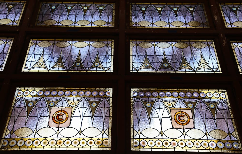 the highly unusual dining room “stalactite” ceiling was given a basic white paint finish, which may have been a “nod” to the 1893 columbian exposition’s “white city.” the room’s east wall is stacked with brilliantly colored, monogrammed variegated art glass windows (executed by chicago decorators healy & millet) likely designed to wash the neutral-colored ceiling with an array of colors that danced along to the movement of sunlight throughout the day.