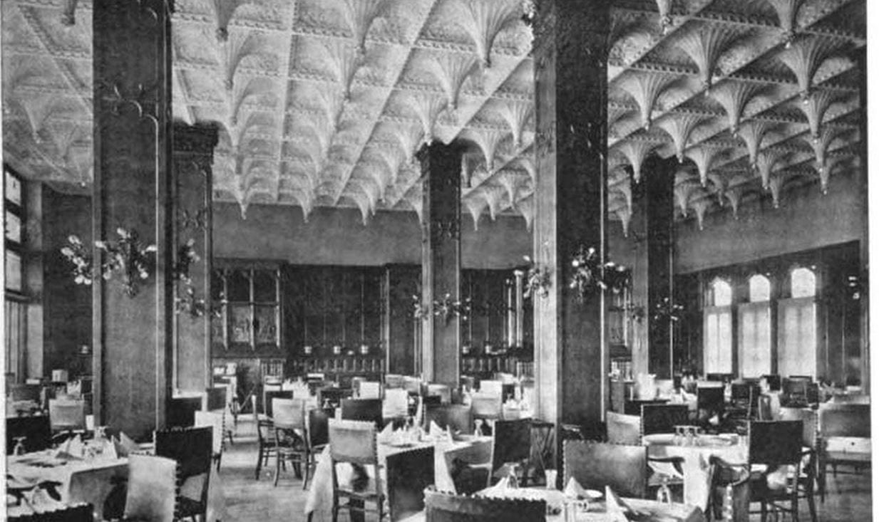 one of the most visually striking and architecturally distinctive features within notable architect henry i. cobb’s chicago athletic association building (1893) is the highly detailed, tracery-laden “drooping tip” cast plaster ceiling, comprised of interlocking gridded panels reinforced with metal mesh cones and illuminated with single incandescent “bare bulb” lights accentuating the tips.