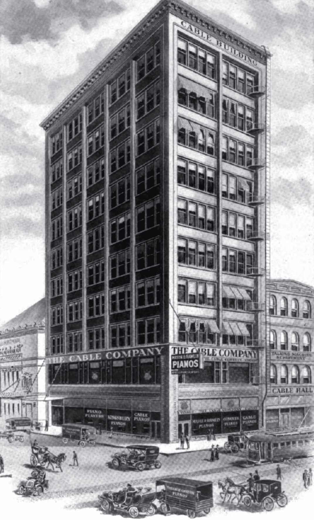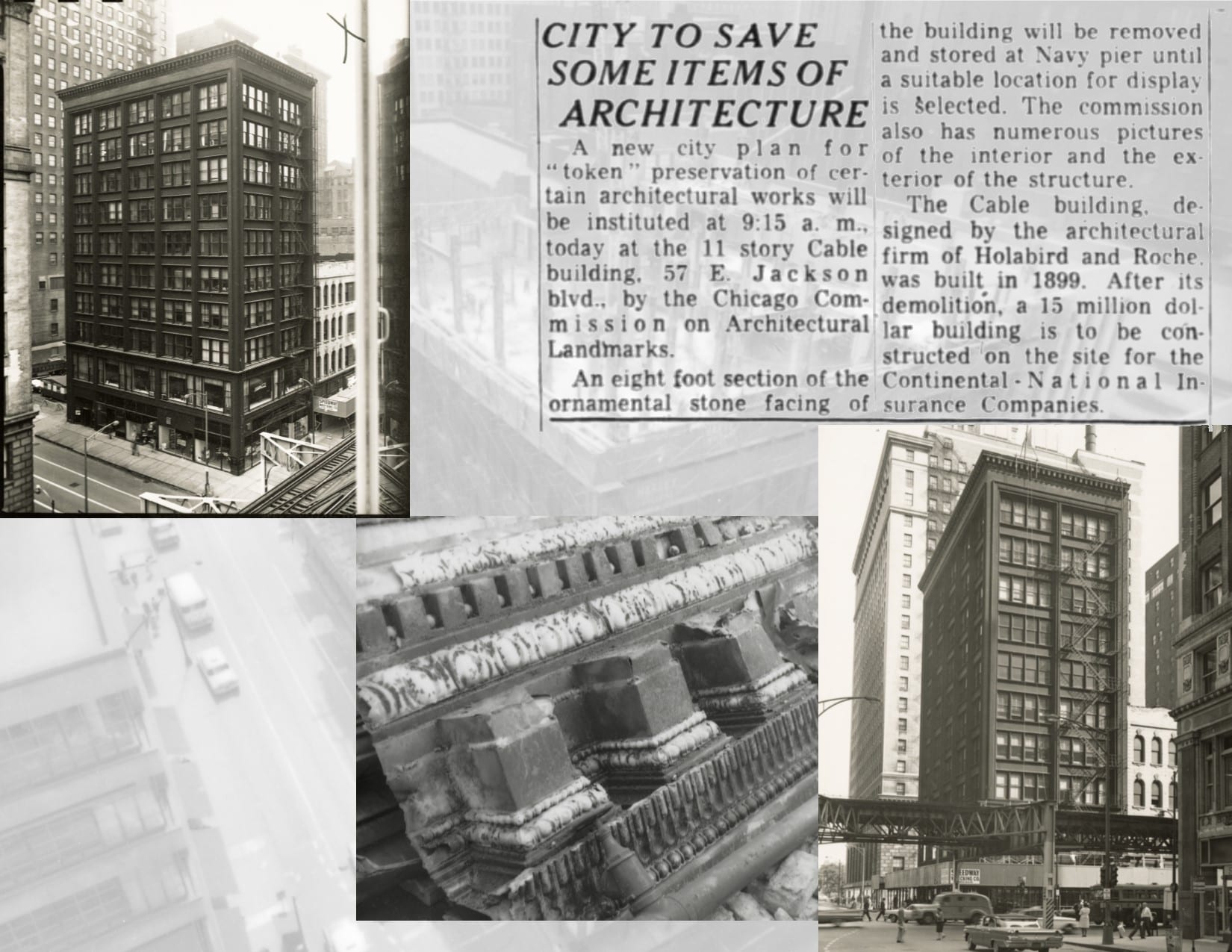 the cable building’s demolition was set in motion as early as 1954,when a chicago tribune article announced the sale of the ten-story building to the american glass company. plans were made to remodel the building into various shops, which effectively lengthened the building’s lifespan for a few years. by 1962 however, the introduction of a mid-century skyscraper designed by c.f. murphy sealed the building’s fate and it was demolished soon after.