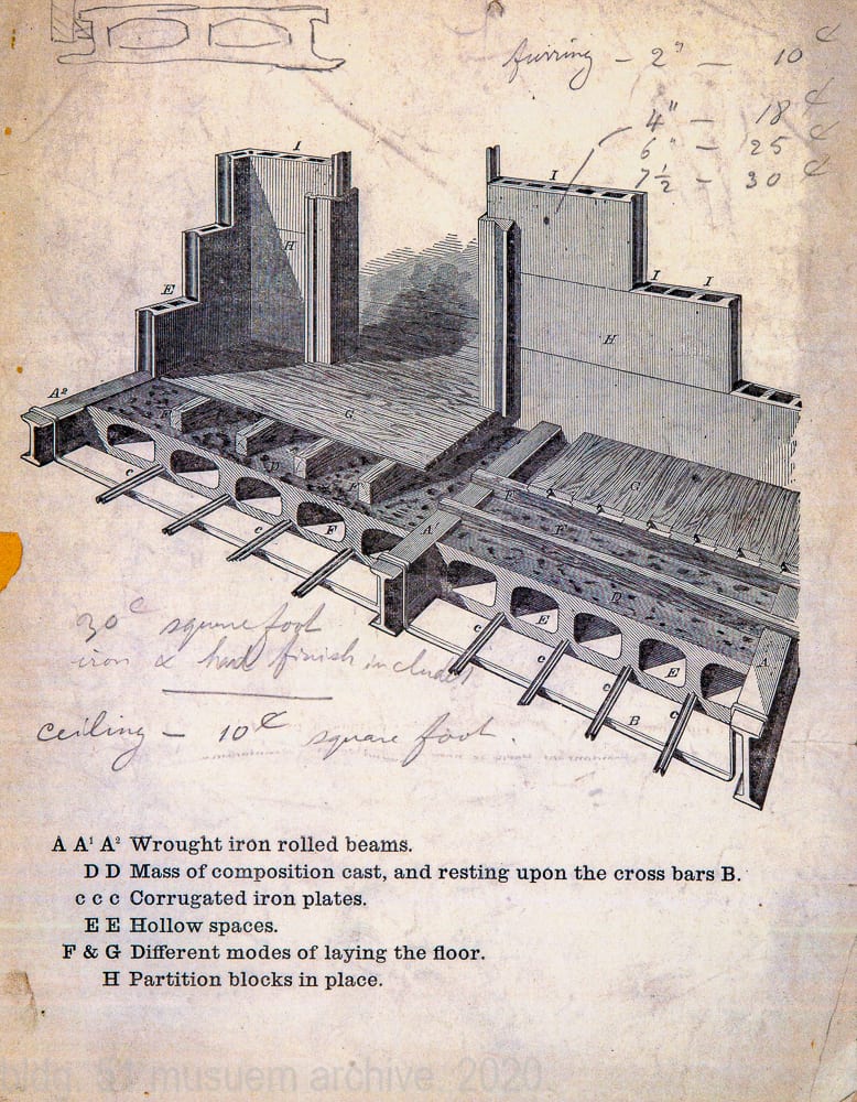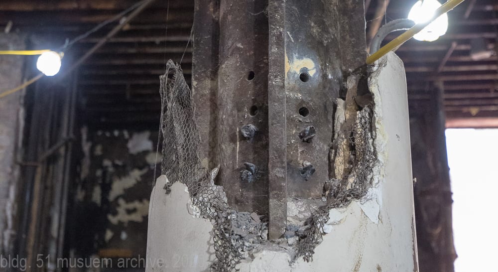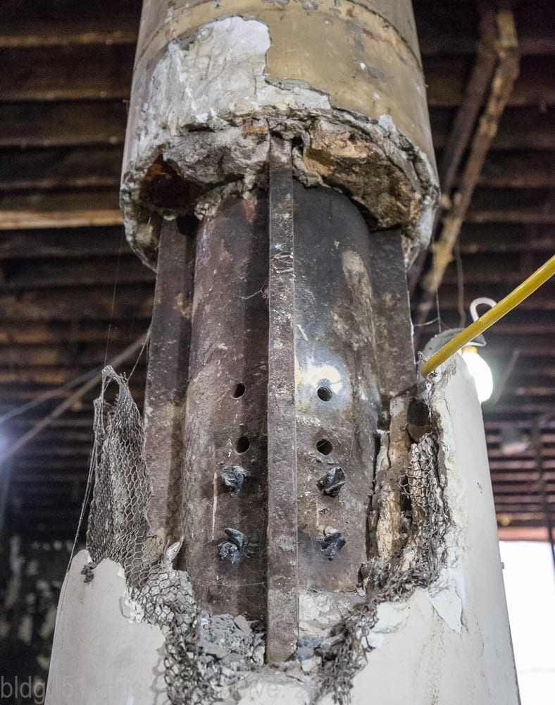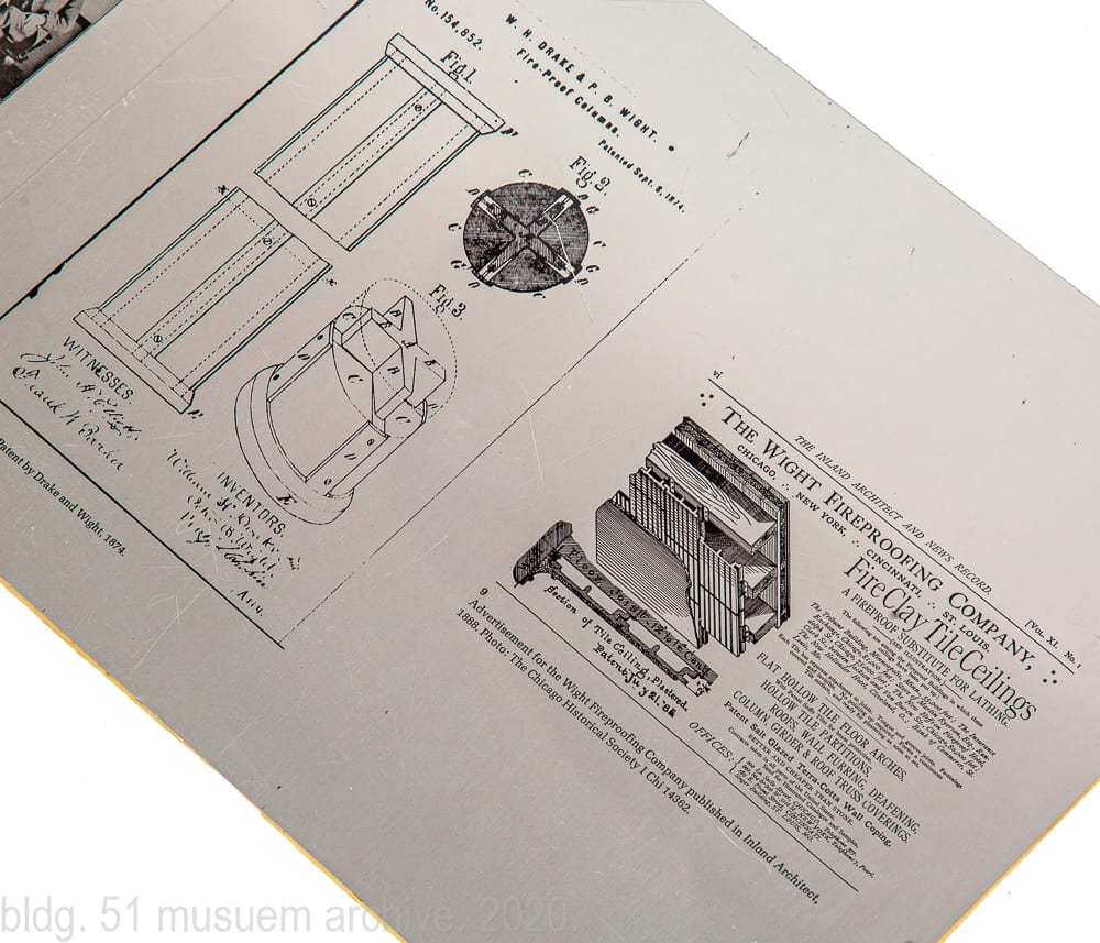 the bldg. 51 building material archive recently salvaged examples of original clay tile panels applied to structural cast iron columns and beams within adler and sullivan’s five-story s.a. maxwell building loft building  (1881) during its transformation into living quarters located on the previously dormant upper floors. the materials were carefully documented and placed within safe storage onsite. the fireproofing materials extracted from replaced columns and beams likely represent the earliest known use of wight’s clay tiles within an extant building.