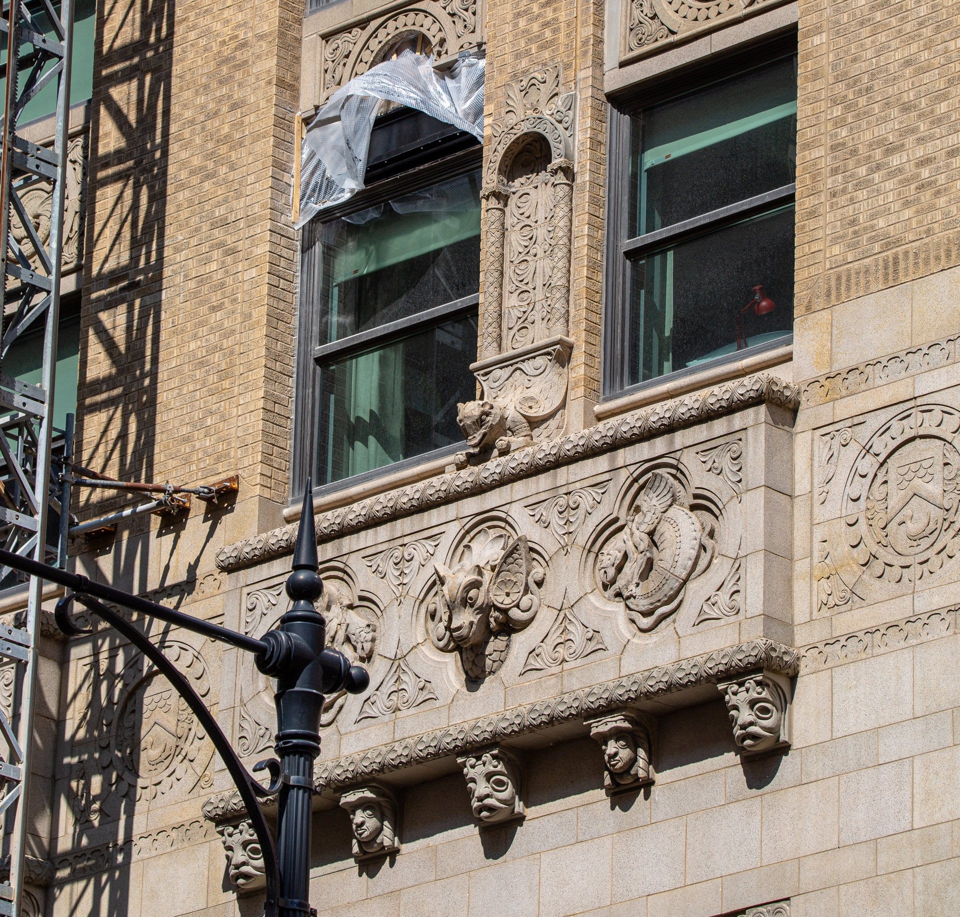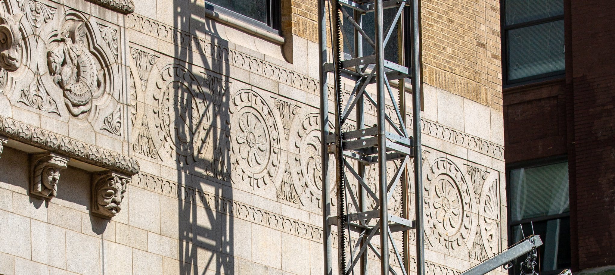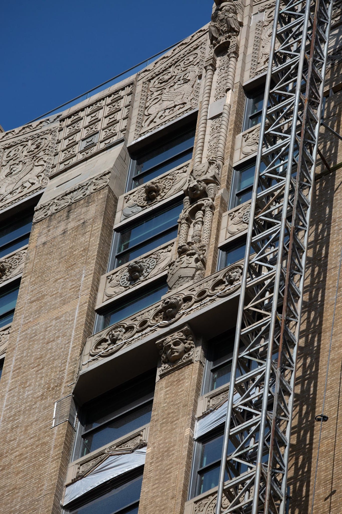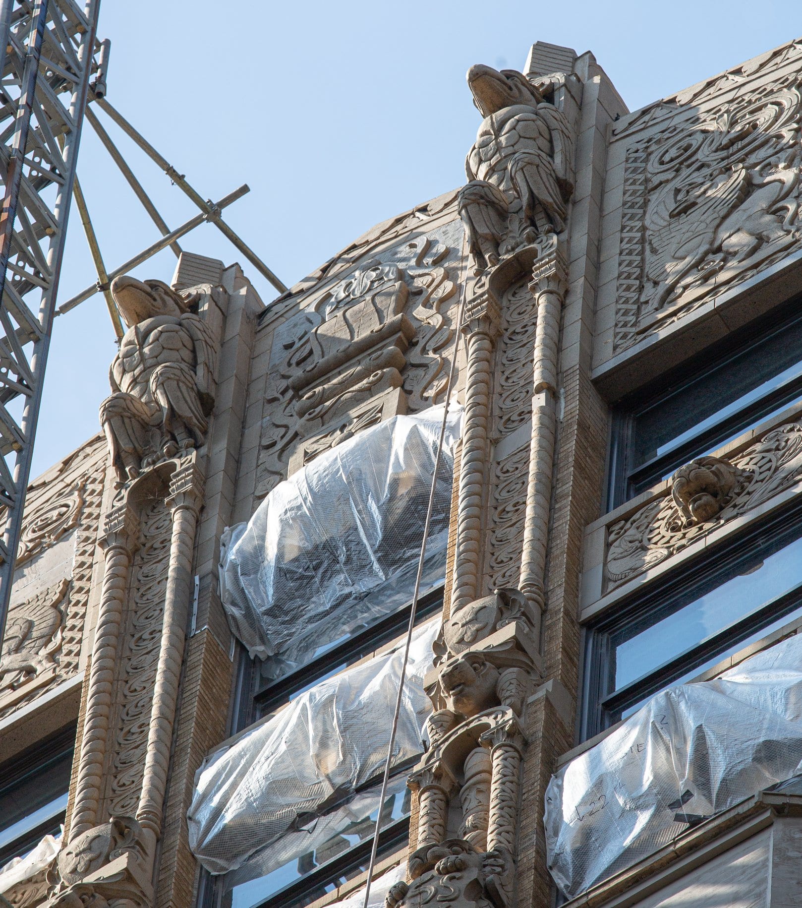 exterior terra cotta restoration work underway on rapp and rapp’s old dearborn bank building (1928).