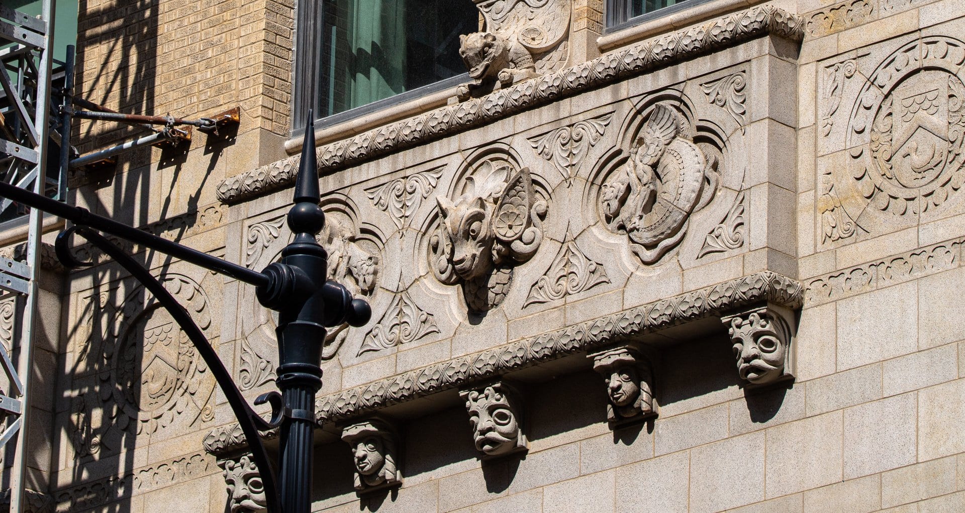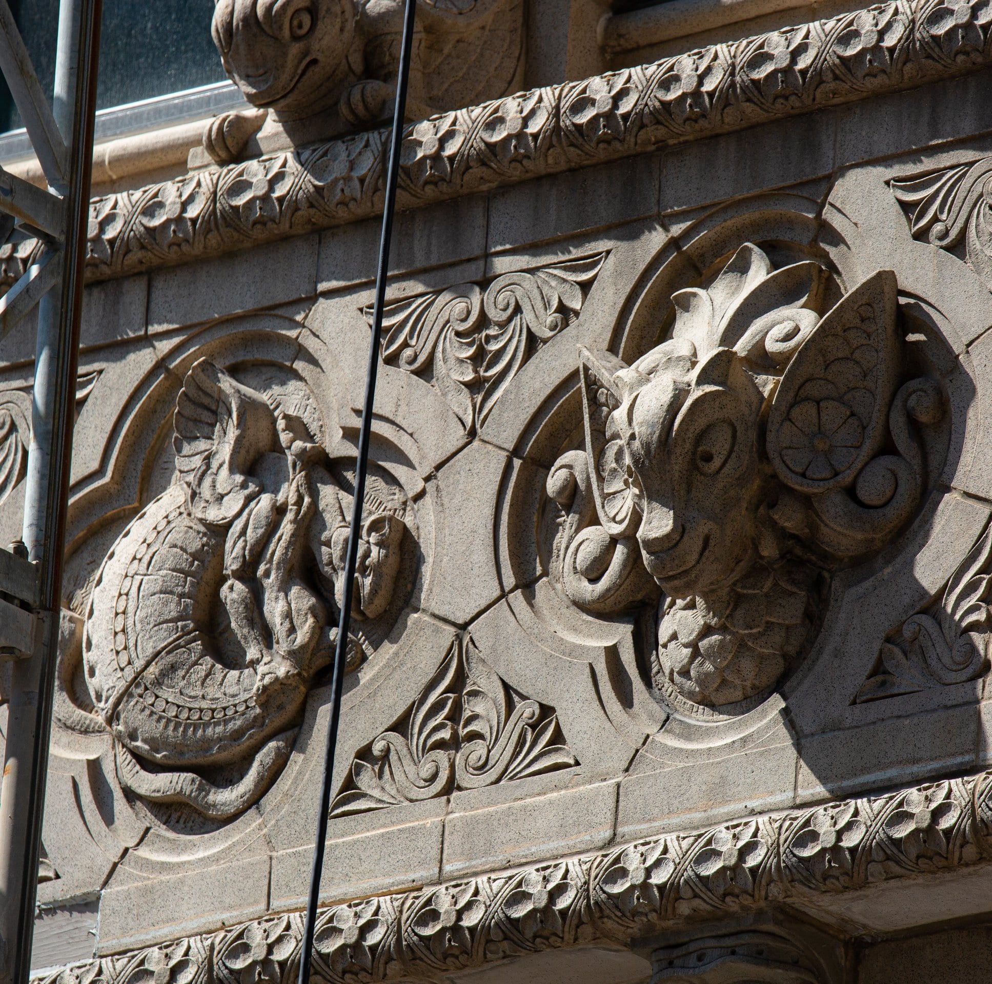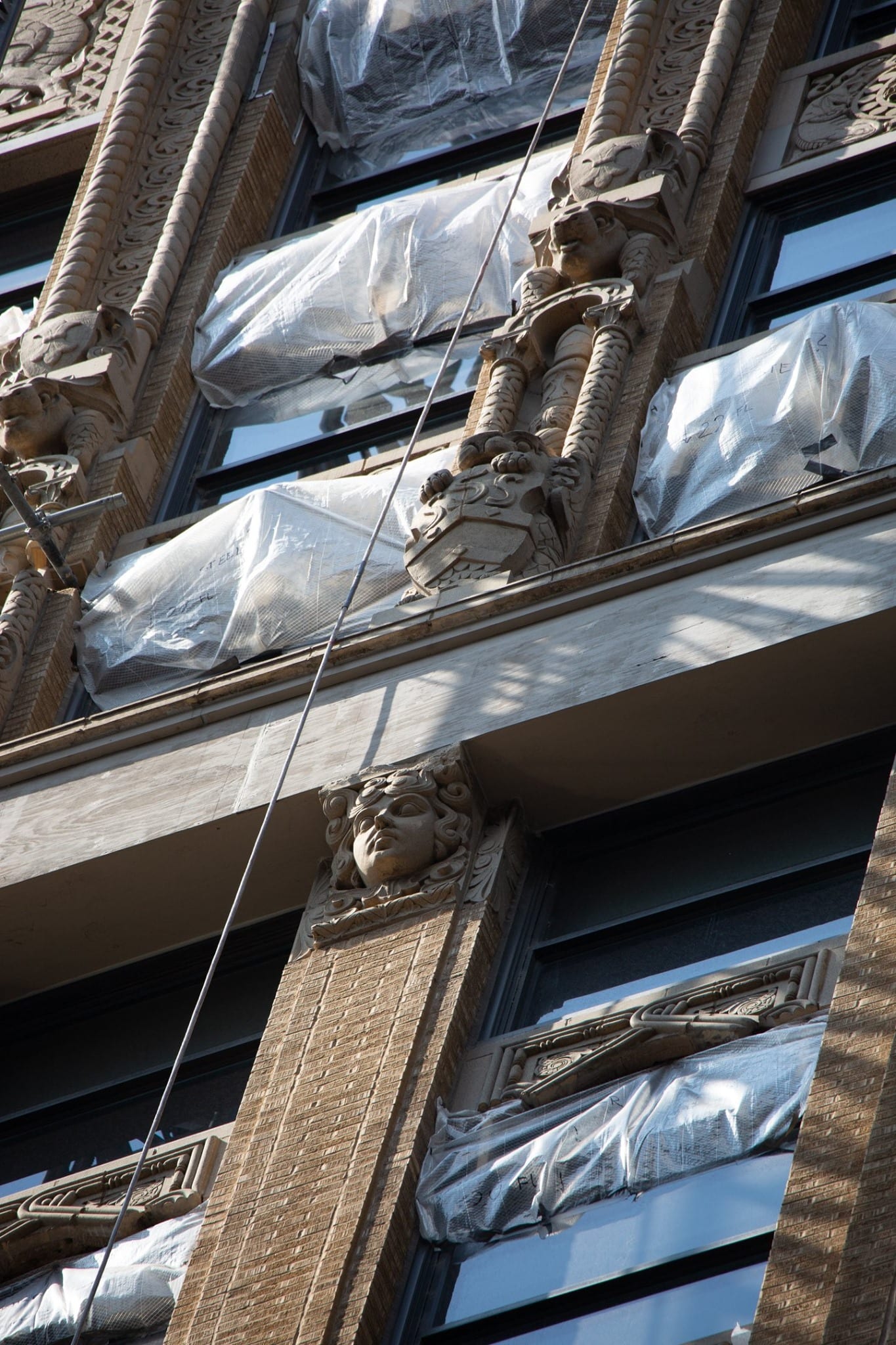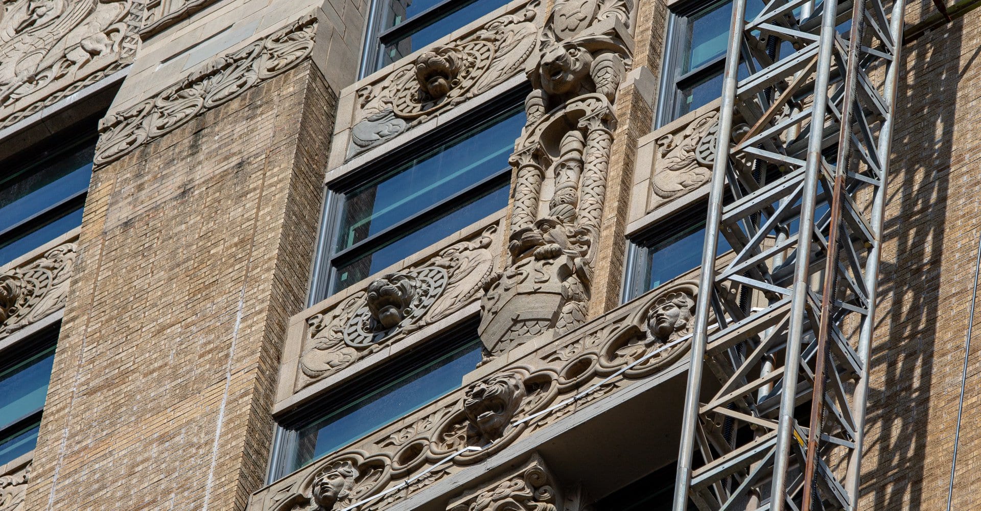 exterior terra cotta restoration work underway on rapp and rapp’s old dearborn bank building (1928).
