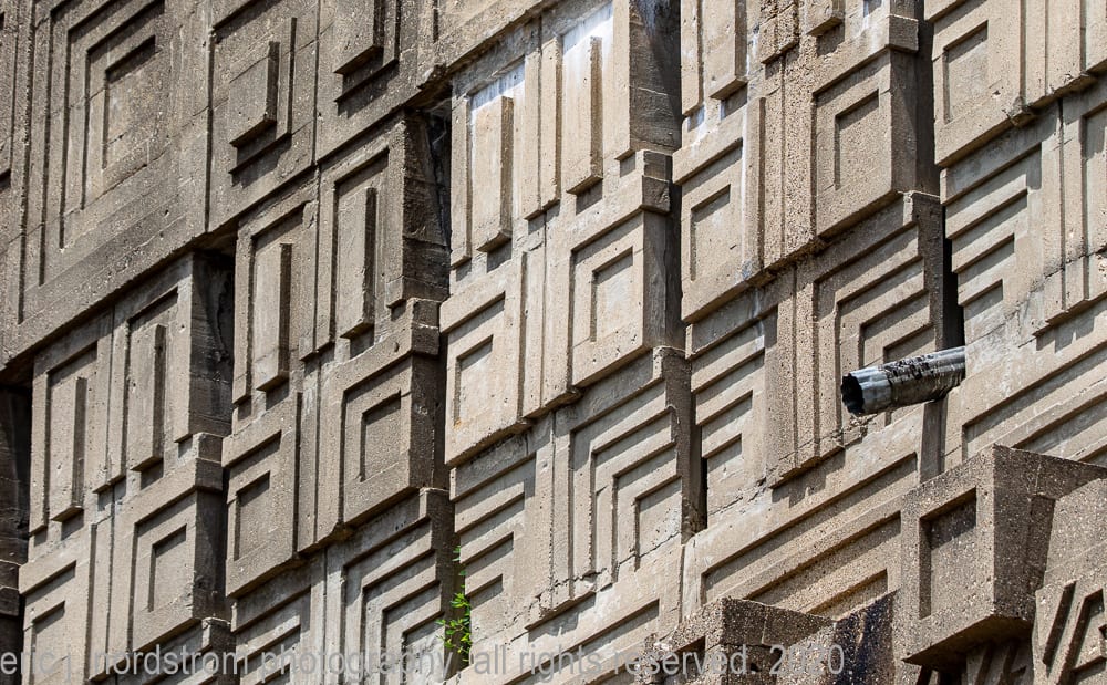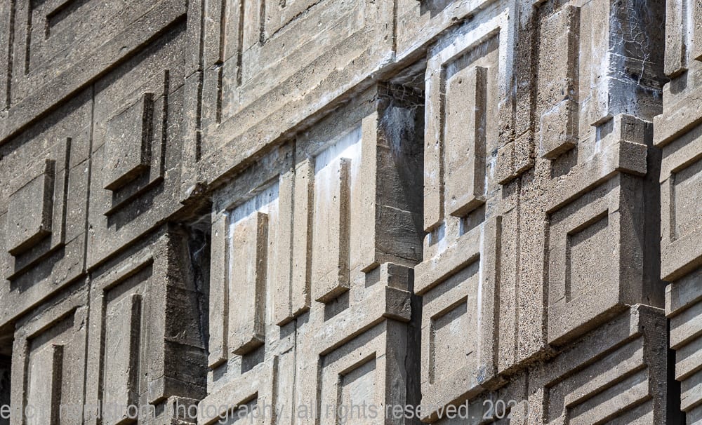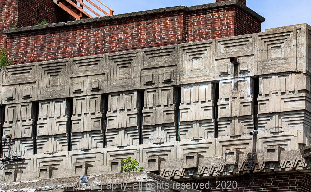 the strongly geometric, mayan-revival style three-part frieze panels were erected by concrete poured into wooden molds set into place. double-scaffolding was required to transport concrete to fill the molds using wheelbarrows from start to finish.