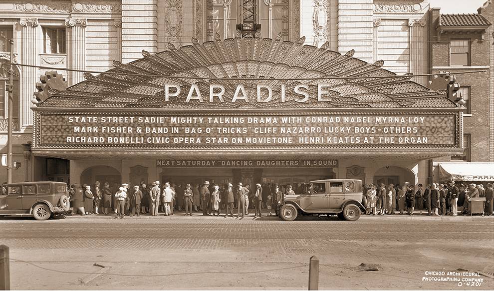 the non-extant paradise theatre (1928) was one of balaban and katz’s finest “movie palaces,” located on chicago’s west side (garfield park neighborhood). it was considered the “world’s most beautiful theater” at the time of its opening on september 14th, 1928. designed by architect john eberson, the “atmospheric” interior, coupled with an ornamental terra cotta exterior was impressive both in sheer size and attention to detail, reflected in the craftsmanship exhibited by its skilled workers.