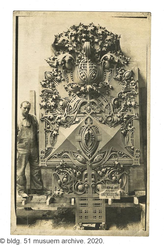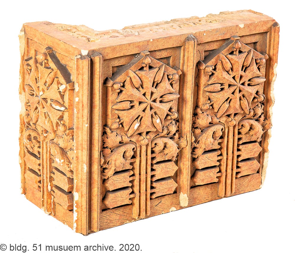 the two most notable fragments acquired by the bldg. 51 museum archive, were salvaged from the edison school’s main entrance cornice. the pattern is often referred to as the “snowflake,” which was used in various configurations on the building’s exterior.