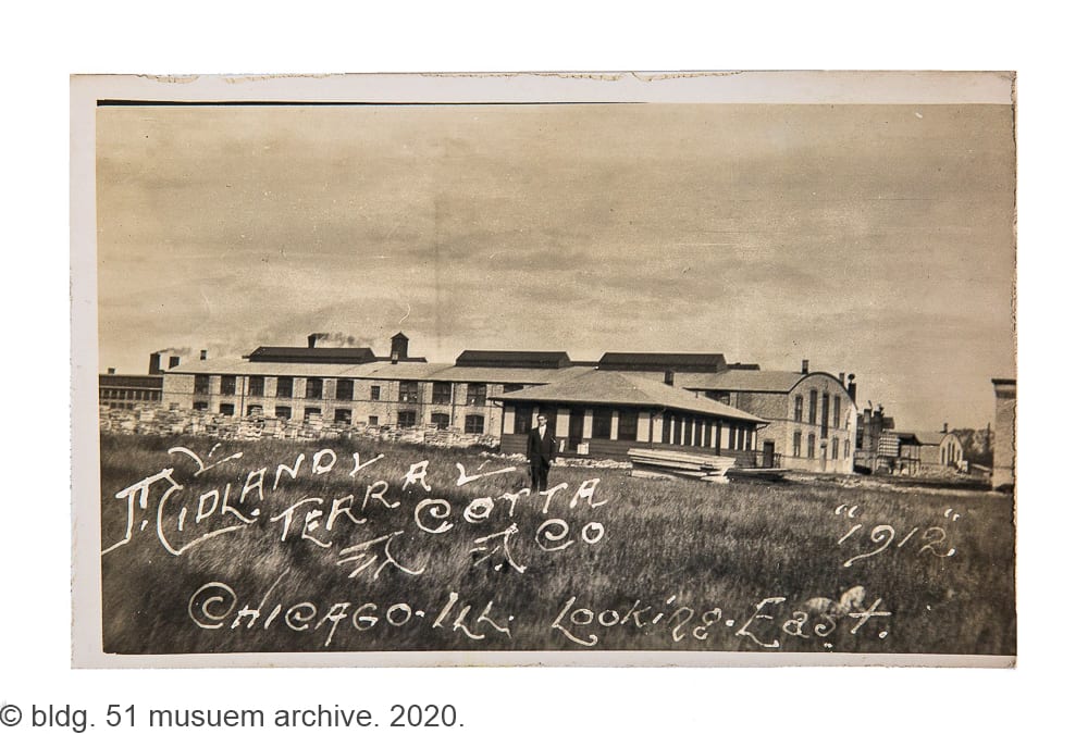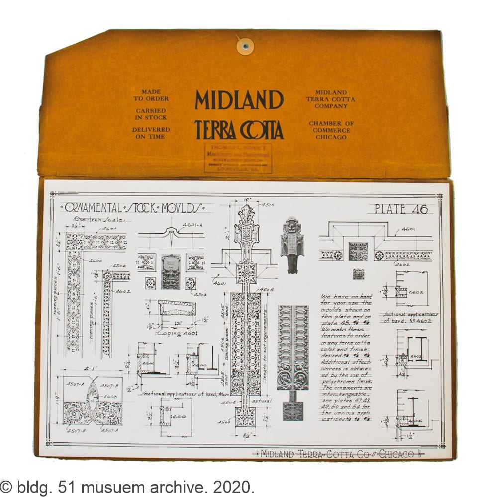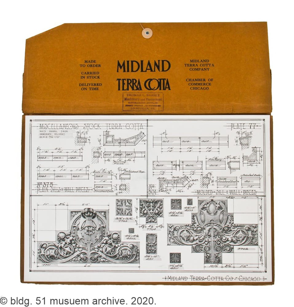 the richly colored mottled red over orange slip glazed terra cotta ornament, including the fragments recently acquired by the bldg. 51 museum, were modeled by fritz albert (who replaced long-time elmslie and sullivan collaborator kristian schneider, who died in august of 1935) for the midland terra cotta company. interestingly, midland, who began operations in 1910, produced wildly popular catalogs heavily populated with “stock patterns” emulating both elmslie and former boss and mentor, louis h. sullivan.