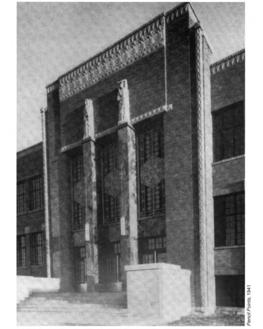 the first and largest school was the thornton township high school (1935), located in calumet city, ills. the other three, located in hammond, ind, were the thomas a. edison, iver p. morton and washington irving schools. despite differences in compositional arrangements and/or configurations, the schools shared the use of ornamental terra cotta (slip glazes varied) and roman brick, along with abstract terra cotta statues, figures and screens by artists emil zettler and alfonso iannelli (the latter did work for frank lloyd wright on multiple commissions including midway gardens, 1914-1929).