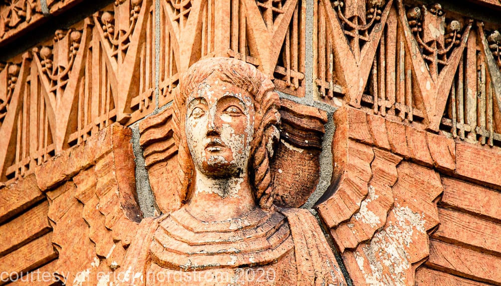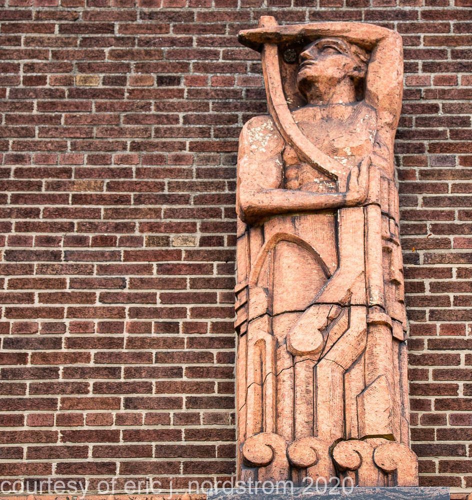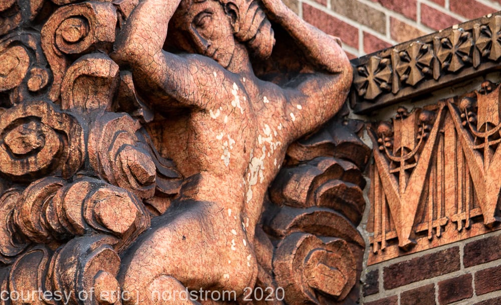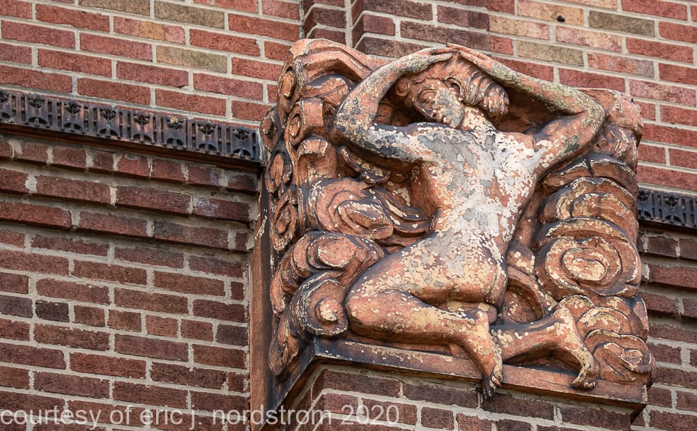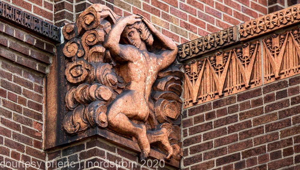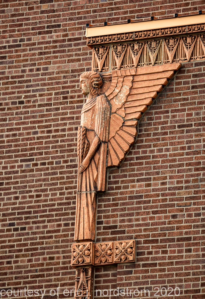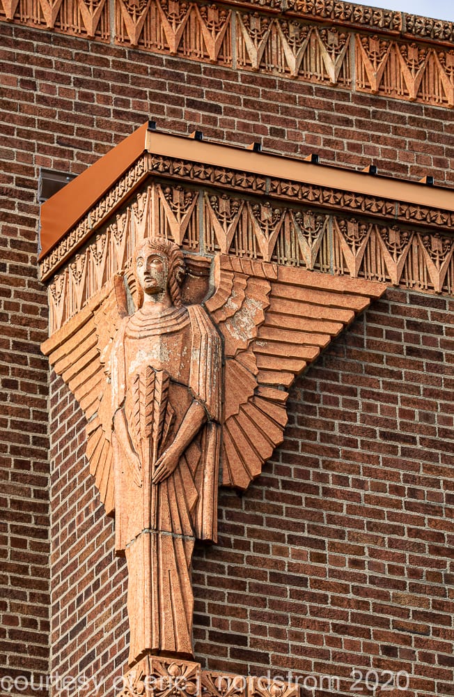 the mottled reddish-orange slip glaze terra cotta was modeled by architectural sculptor fritz albert, who was assigned the job after head modeler kristian schneider died in 1935.