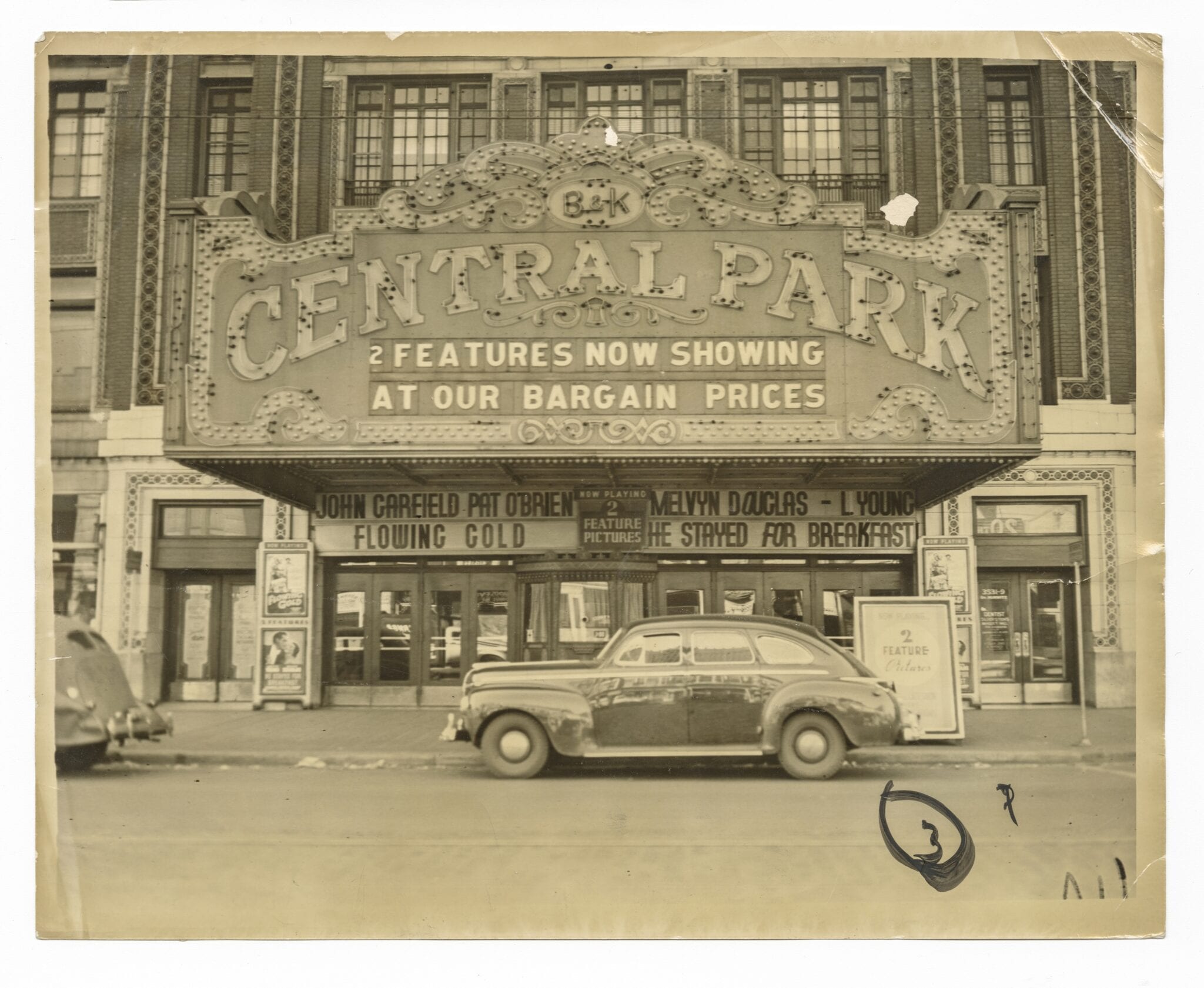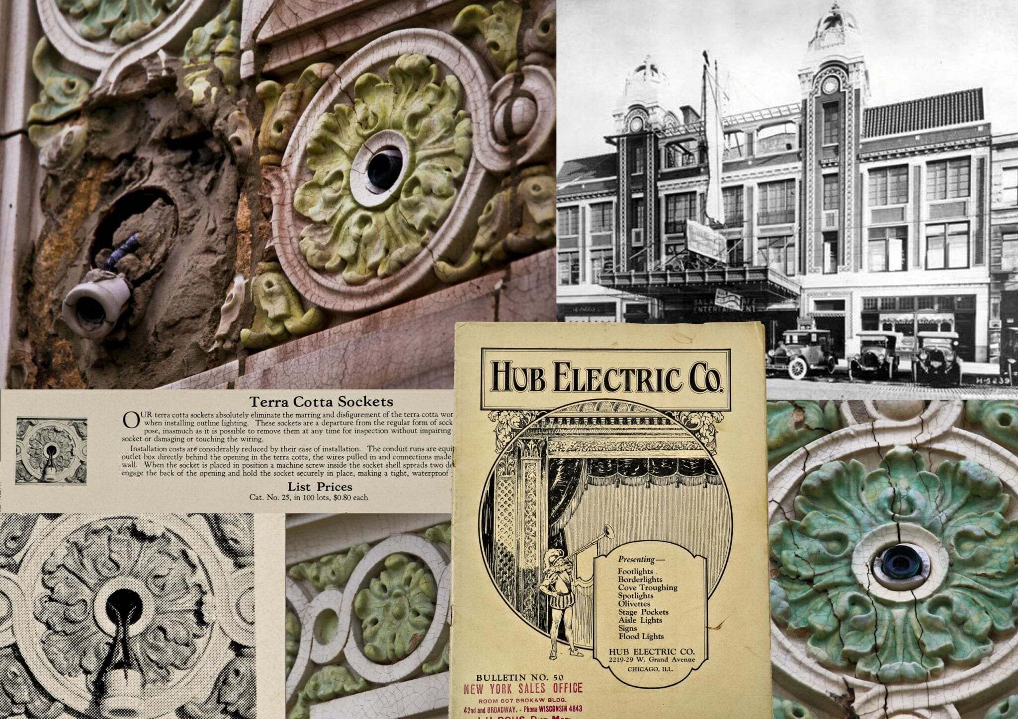 1940 photographic image of horizontal marquee on rapp and rapp’s central park theater (1917). i cannot recall what year the the illuminated bare bulb horizontal marque pictured here replaced the original, which was a more subdued looking awning devoid of the flashy oversized lettering. the original configuration is shown in the second image used in an old post i did on the theater’s glazed exterior terra cotta designed for use with integrated incandescent lights supplied by hub electric. courtesy of ryerson and burnham, art institute of chicago.