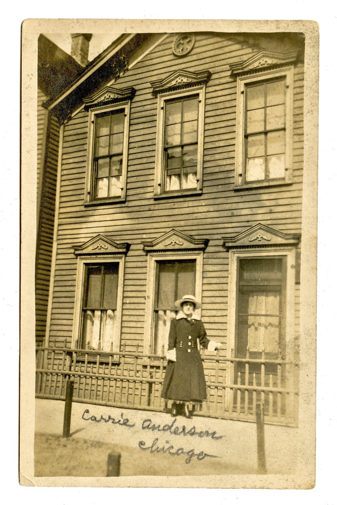 original real photo postcard (rppc) of a two-story 19th century wood-framed chicago cottage taken in the early 20th century. note the pediment window hoods with fret-sawn scrolls, bracketed cornice and decorative oculus.