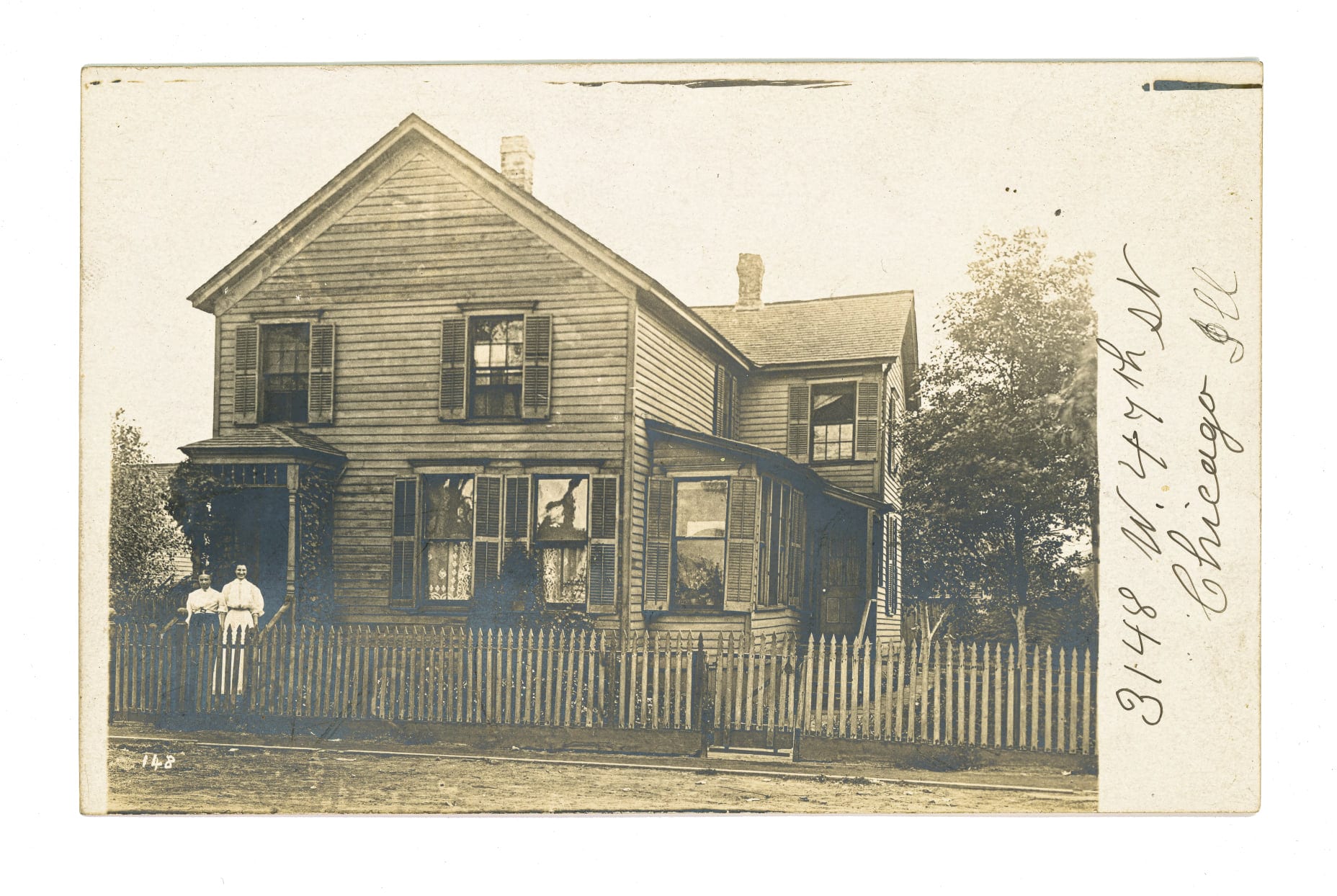 original real photo postcard (rppc) of a 19th century two-story south side chicago clapboard residence with white picket wood fence and occupants standing at entrance beneath porch.